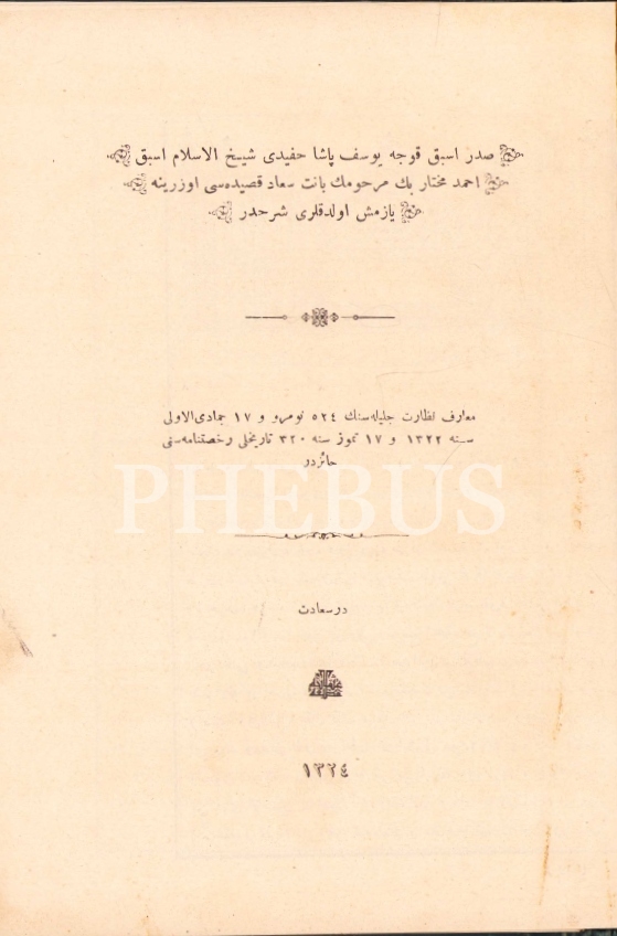 Arapça Bânet Suâd Kasîdesi [Kasîde-i Bürde] Şerhi, Şeyhülislam Ahmed Muhtar Bey, Dersaadet [İstanbul] 1324, 51 s., 17x23 cm, cildi hafif yıpranmış haliyle