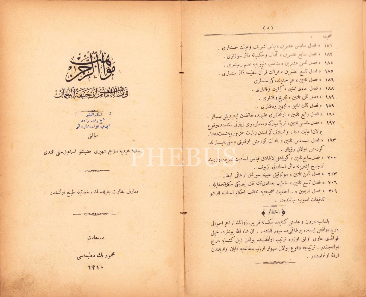 Osmanlıca Mevâhibü'r-Rahman fî Menâkıb-ı İmam Ebi Hanifetü'n-Numan, İsmail Hakkı Efendi, Mahmud Bey Matbaası, Dersaadet [İstanbul] 1310, 214 s., 15x24 cm