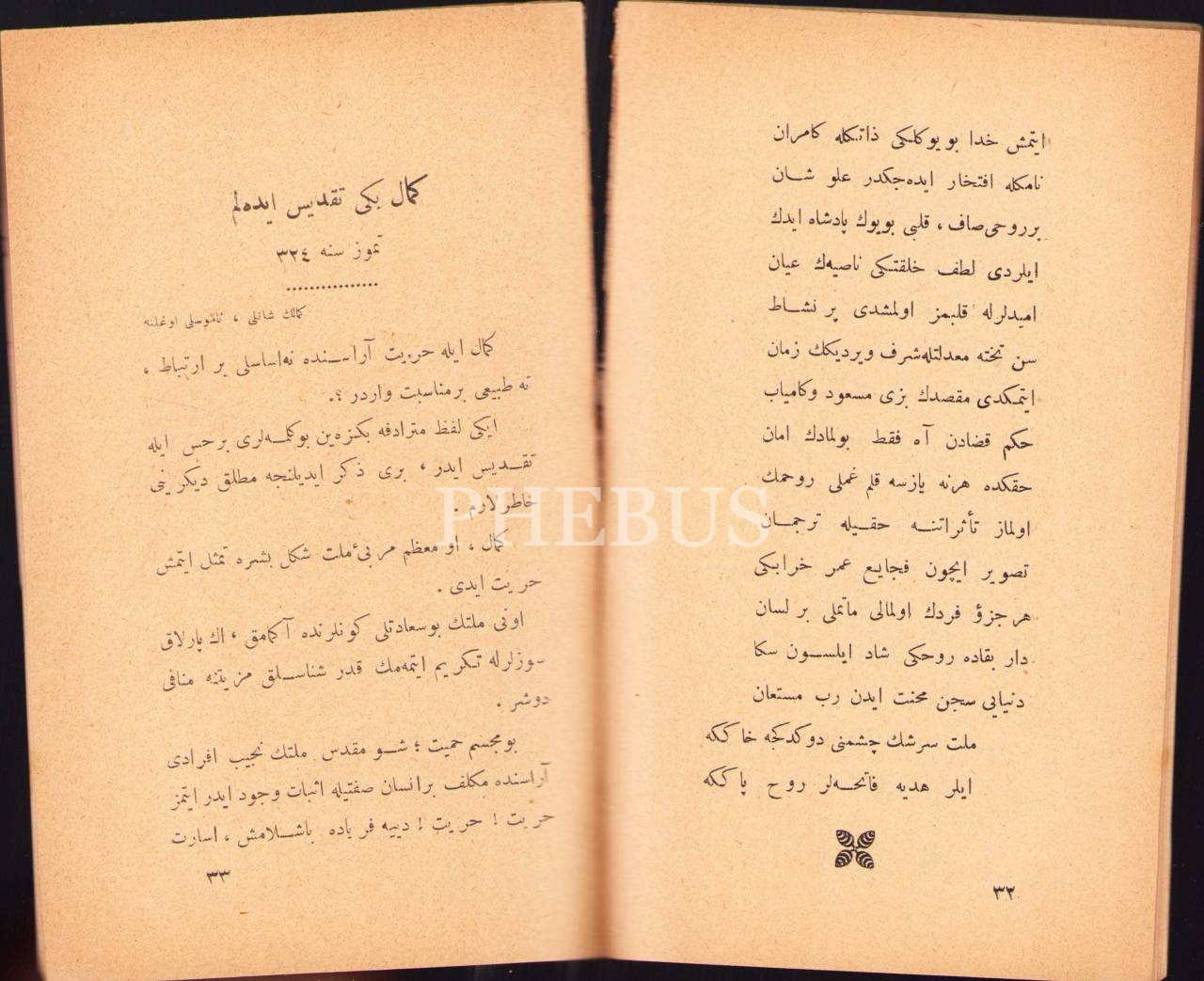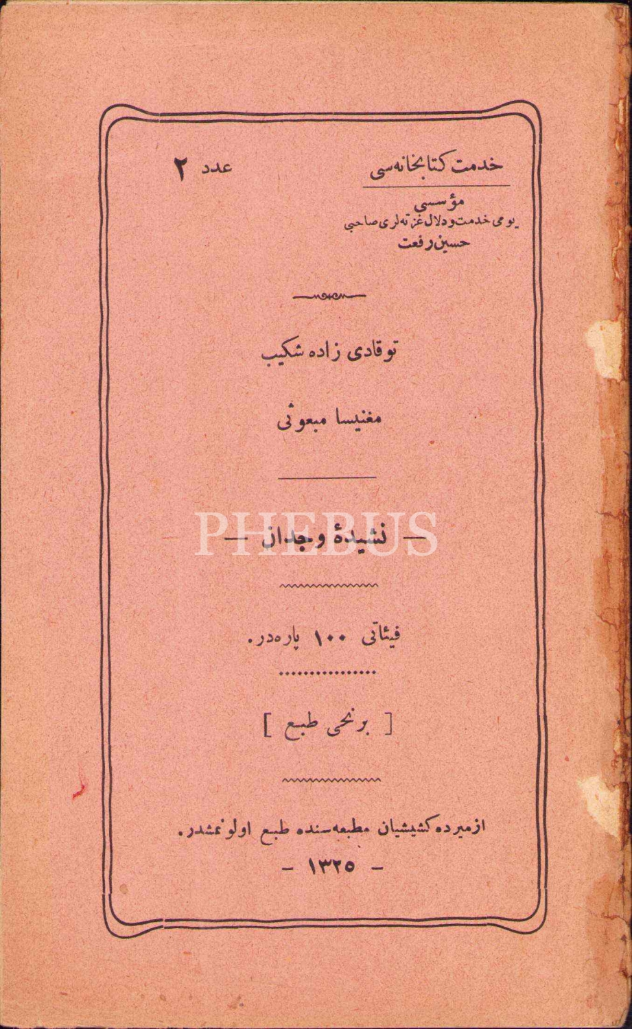 Osmanlıca Neşîde-i Vicdân [1. baskı], Tokadizade Şekib, Keşişiyan Matbaası, İzmir 1325, 51 s., 11x18 cm, sırtı yıpranmış haliyle
