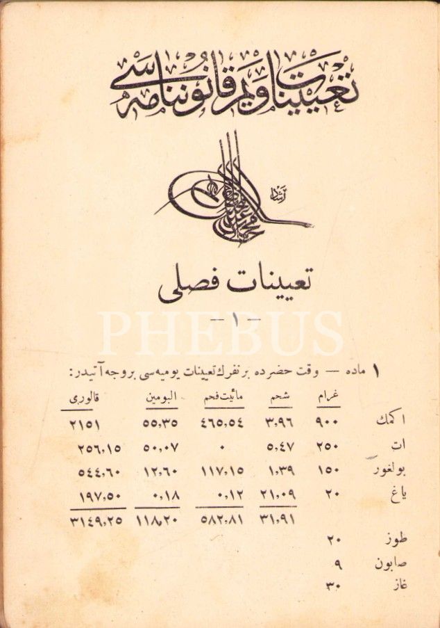 Sultan Reşad tuğralı Osmanlıca Ta'yînât [Tayın] ve Yem Kânûnnâmesi, Sabah Matbaası, 89 s., 12x18 cm, cildi hafif yıpranmış haliyle
