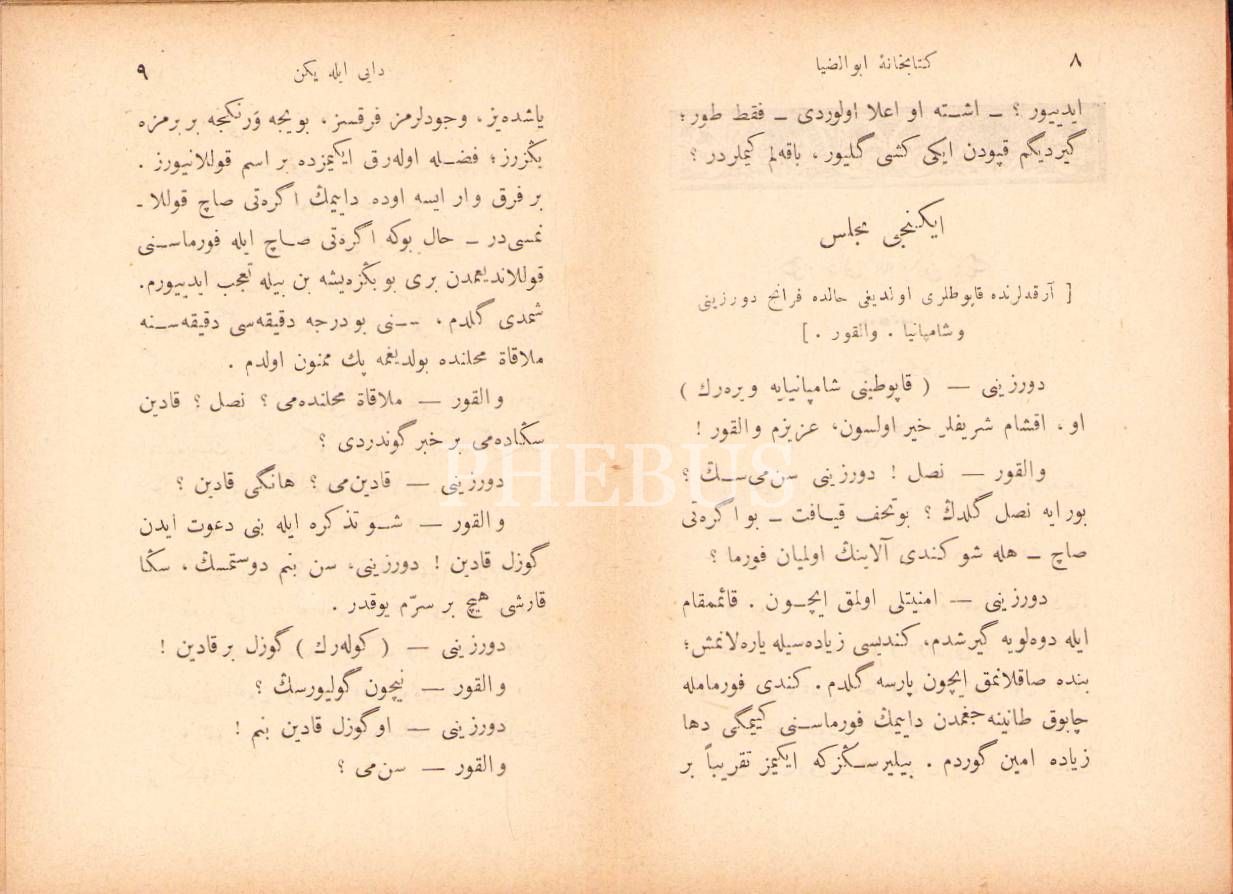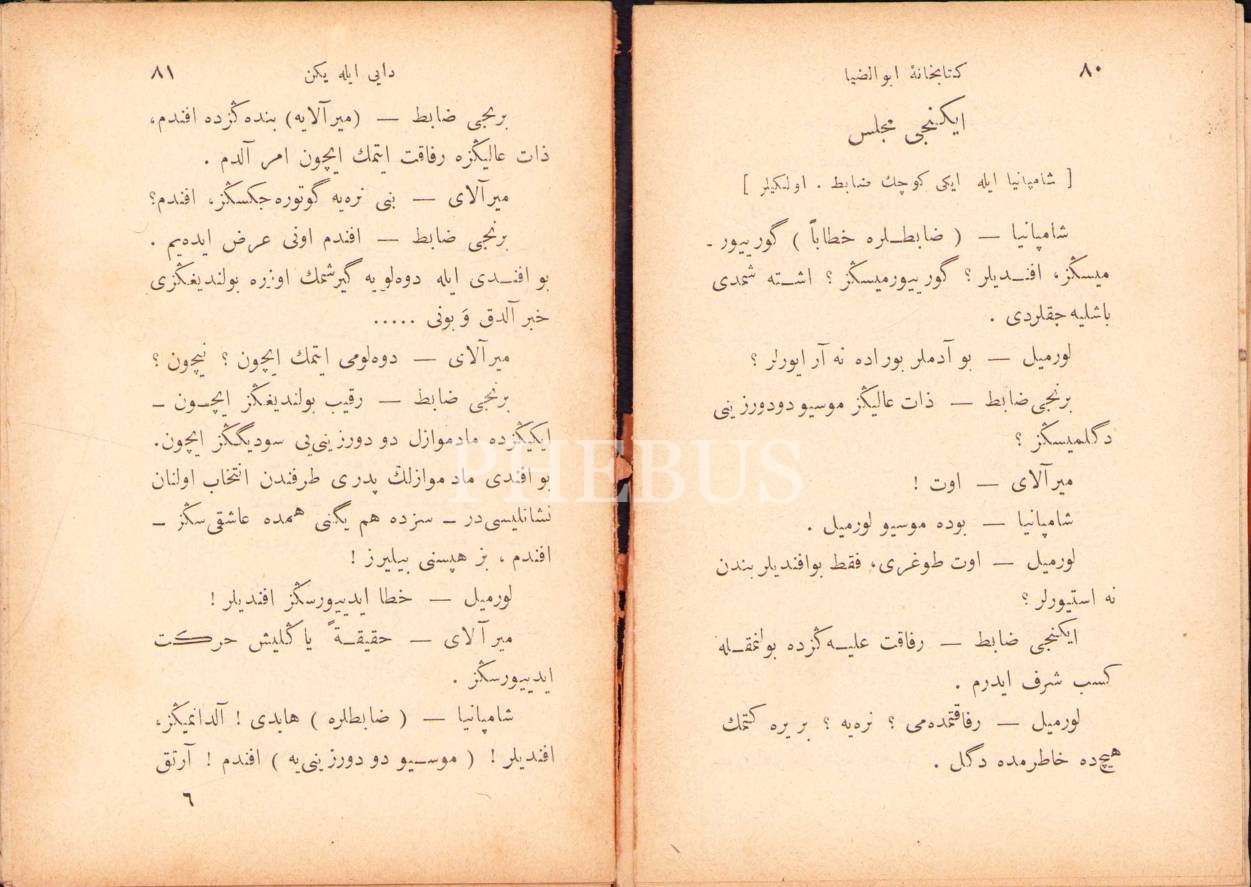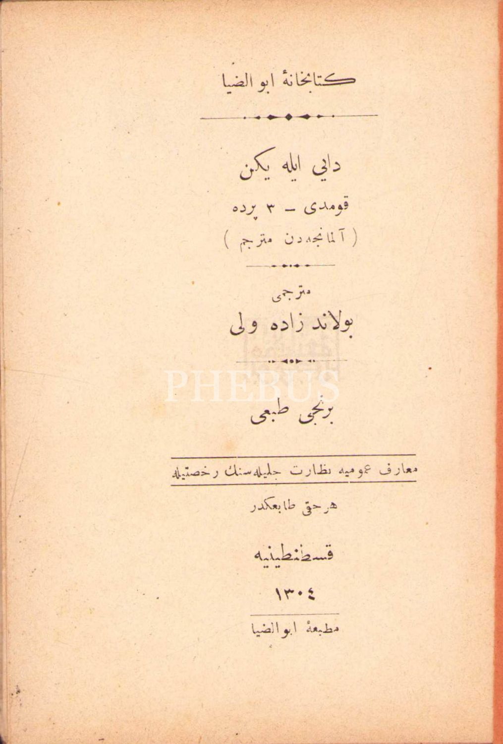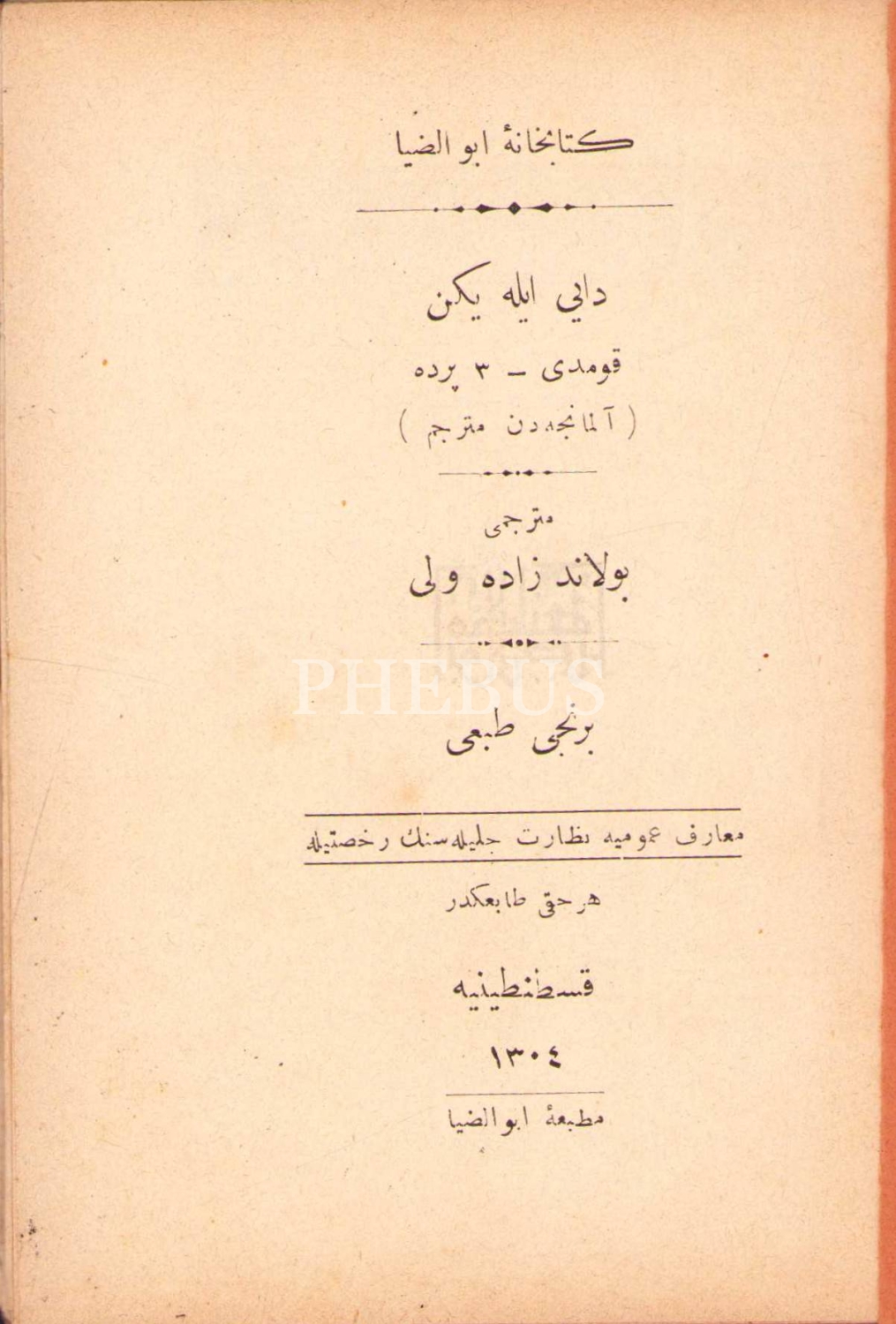 Osmanlıca Dayı ile Yeğen [Komedi], Almancadan çev. Bolandzade Veli, 1. baskı, Ebuzziya Matbaası, Kostantiniyye 1305, 107 s., 10x15 cm, sayfaları açılmamış ve kapak sayfası yıpranmış haliyle
