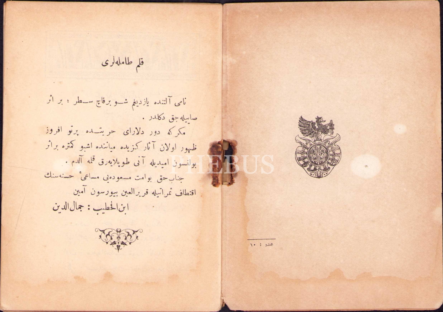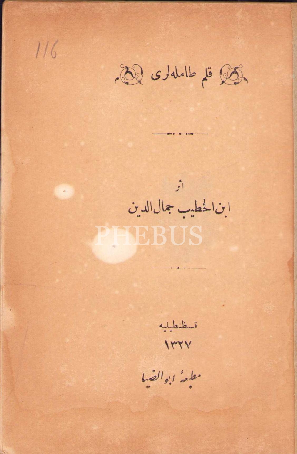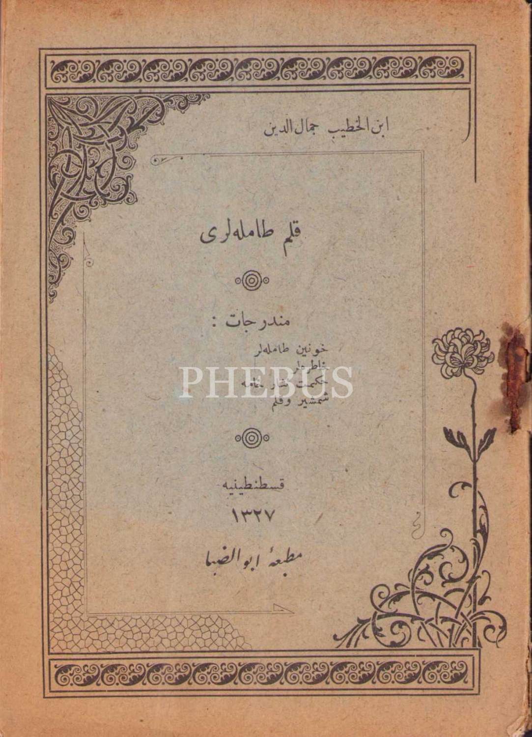 Osmanlıca Kalem Damlaları, İbnülhatib Cemaleddin, Ebuzziya Matbaası, Kostantiniyye 1327, 70 s., 10x14 cm, kapak sayfası ve sırtı yıpranmış haliyle