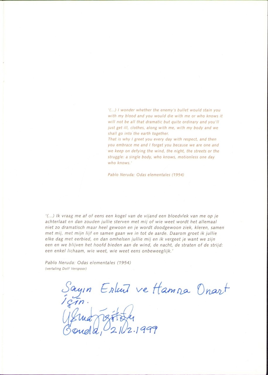 İthaf, "Sayın Erkül ve Hamza Onart için" şeklindedir.