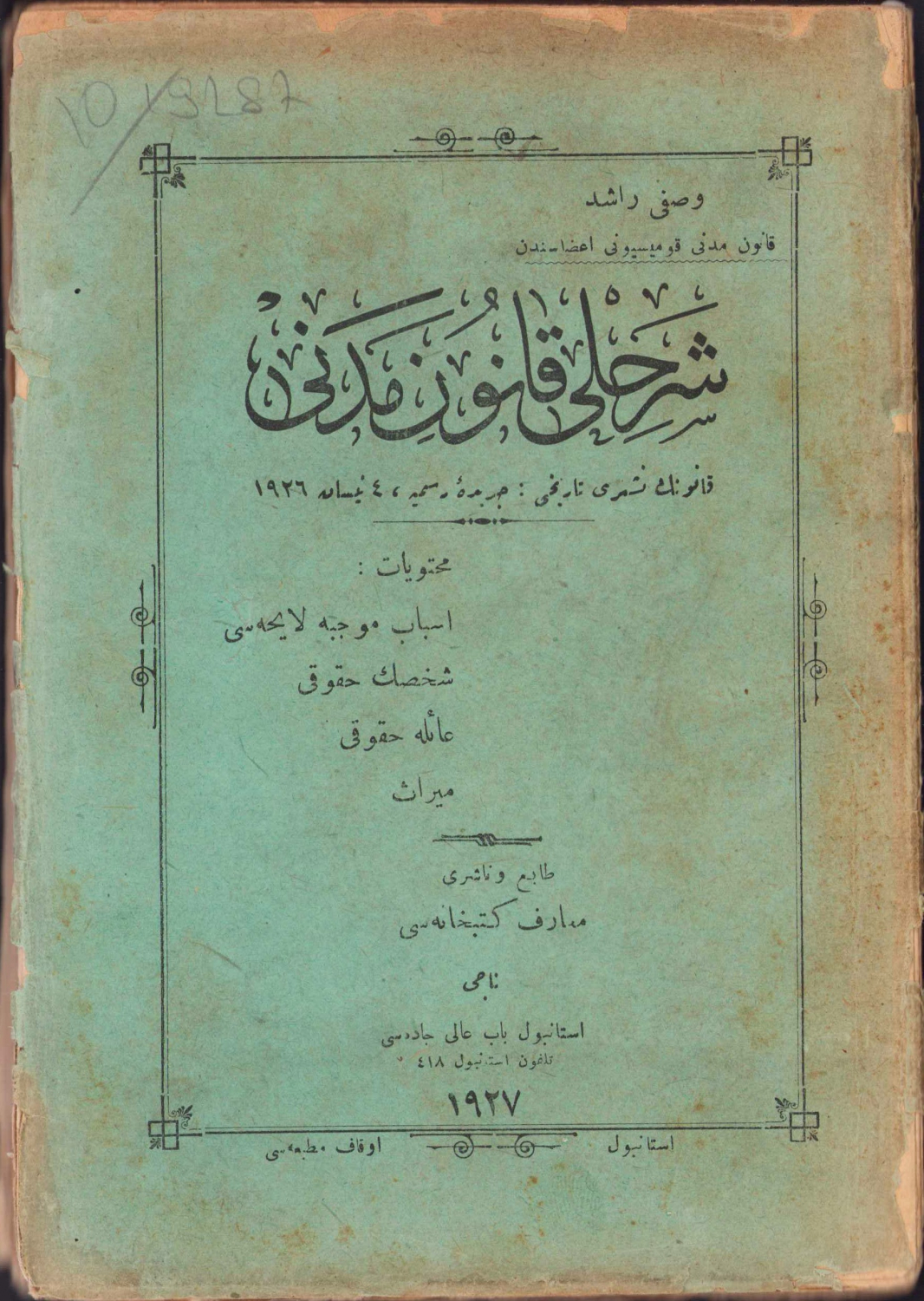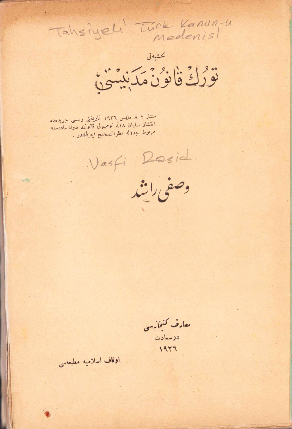 Tahşiyeli Türk Kanunu Medenisi, Yazar Vasfi Raşid, 1927 tarihli, Osmanlıca, 315 sayfa, 16x22 cm
