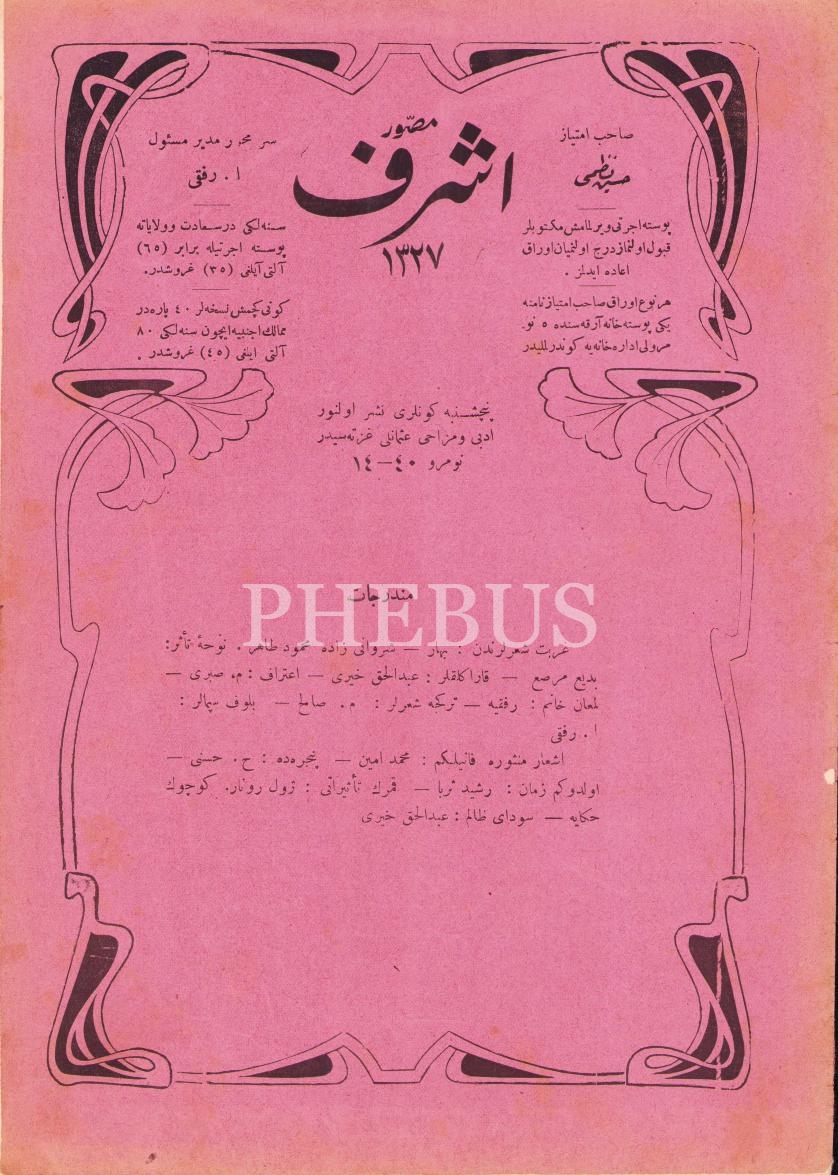 Osmanlıca Musavver Eşref dergisi, sayı: 14-40, 3 Kanunuevvel 1325, Florinalı Nazım Bey'e ait iç kapak görseliyle, 20x28 cm, kapak sayfası ve sayfa kenarları hafif yıpranmış haliyle