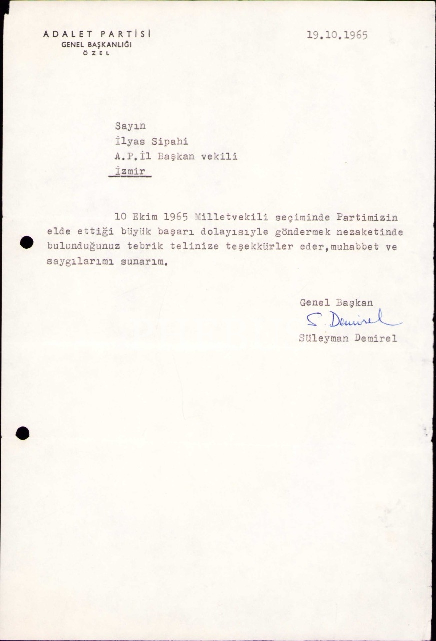 Adalet Partisi Genel Başkanlığı Özel antetli ve Süleyman Demirel ıslak imzalı teşekkür mektubu, 1965 tarihli, 18x27 cm, hafif yıpranmış haliyle