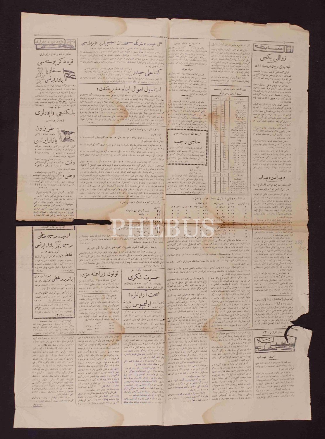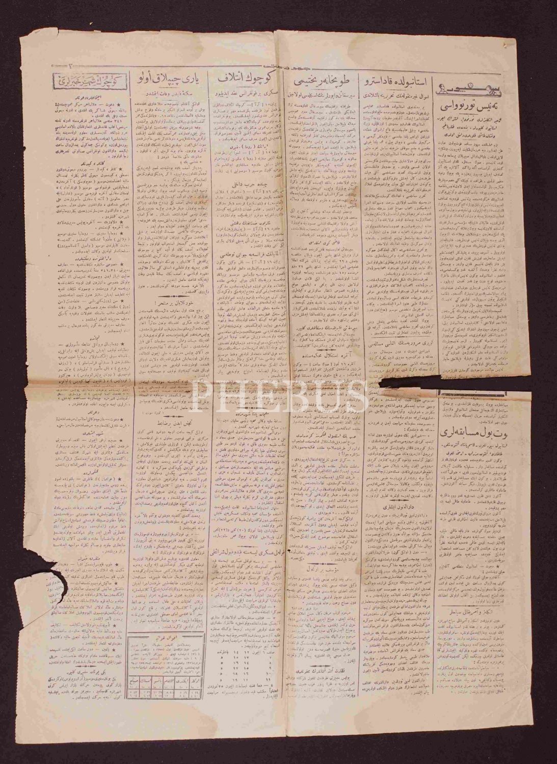 Osmanlıca tek gazete sayfası, 44x61 cm, epey yıpranmış haliyle