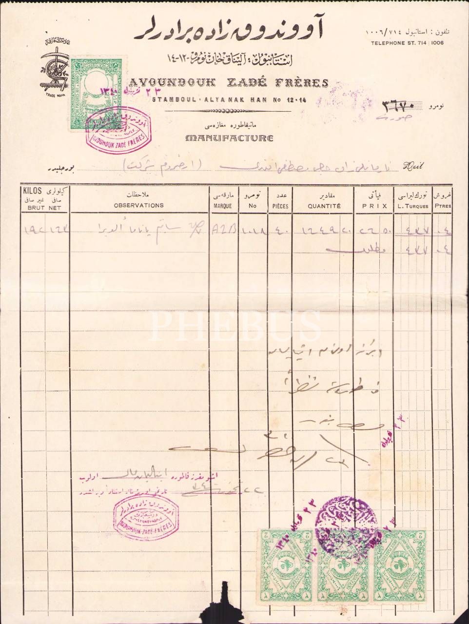 Osmanlıca-Fransızca Avondokzade Biraderler-Manifatura Mağazası antetli fatura, 1340 tarihli, 23x30 cm, alt kenarı yırtık haliyle