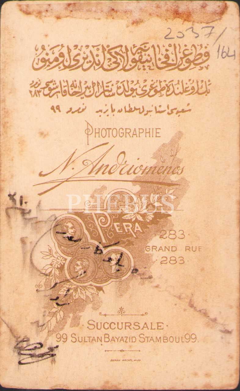 Asker kabin fotoğrafı, N. Andriomenos Fotoğrafhanesi-Stamboul, 1310 tarihli Osmanlıca ithaf mevcut, 6x9 cm, lekeli haliyle