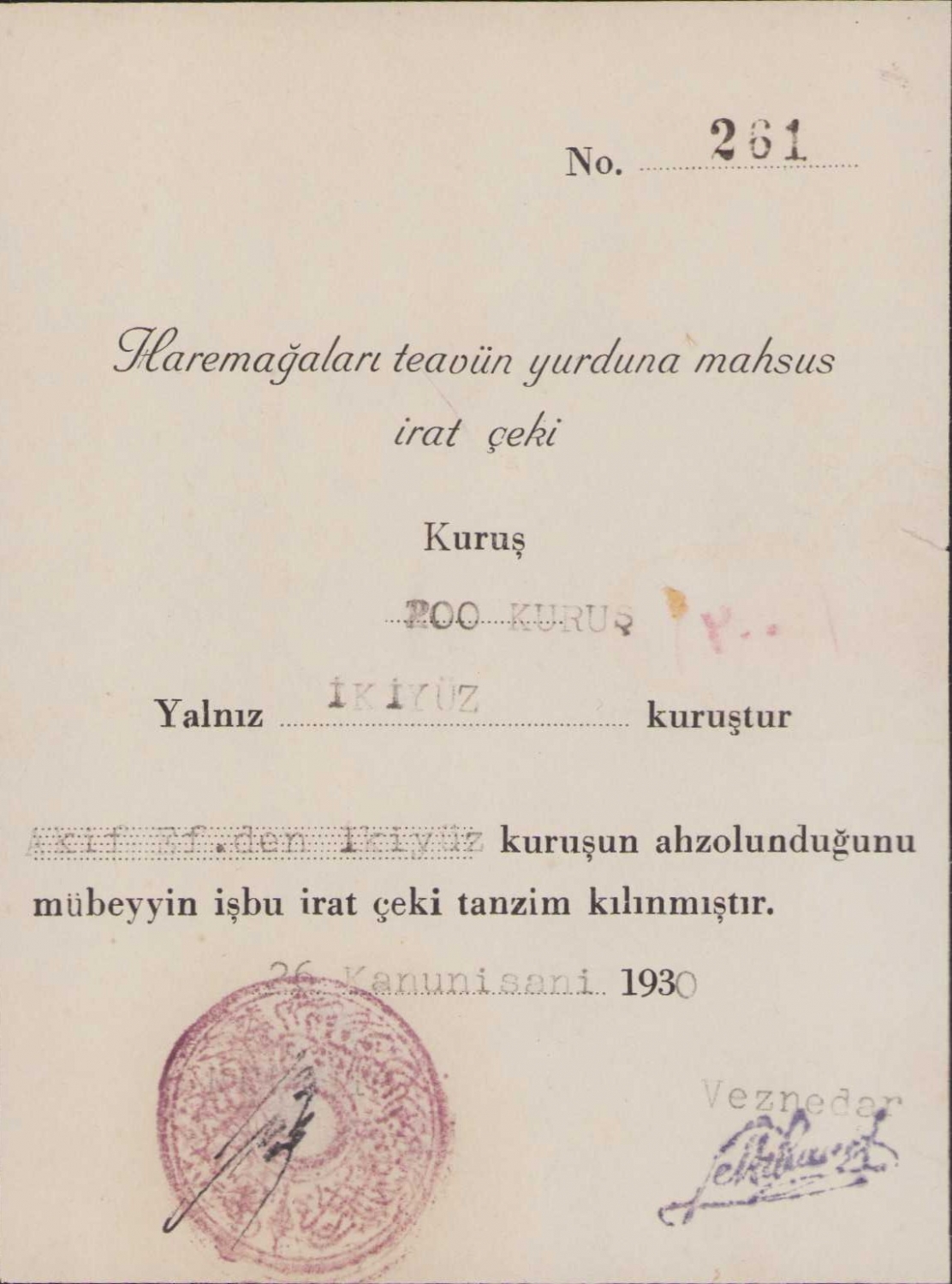Haremağaları teavün yurduna mahsus irat çeki, ederi 200 kuruş, 1930 tarihli, Osmanlıca mühürlü, 10x13cm