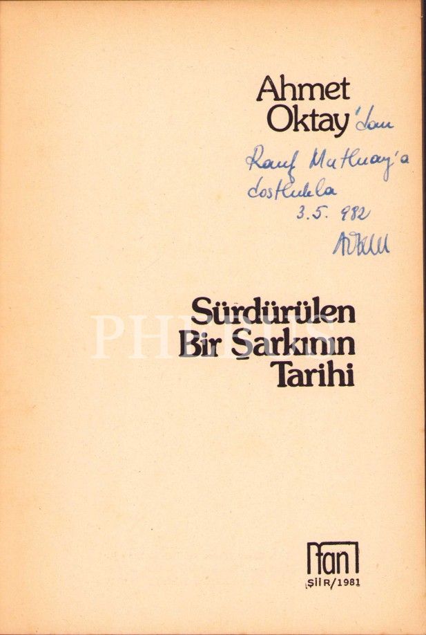 Sürdürülen Bir Şarkının Tarihi-Şiir, Ahmet Oktay, yazarından ithaf ve imzalı, Tan Yayınları, Ankara 1981, 77 s., 13x19 cm, kapağı hafif yıpranmış haliyle