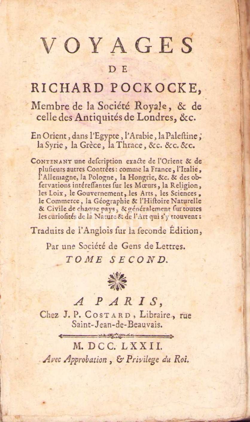 Gezgin Din Adamı Richard Pococke'a Ait Fransızca Osmanlı Seyahatnamesi "Voyages de Richard Pockocke", Paris, 1772, 5 Cilt, kapak ciltleri oldukça yorgun haliyle, 11x18 cm