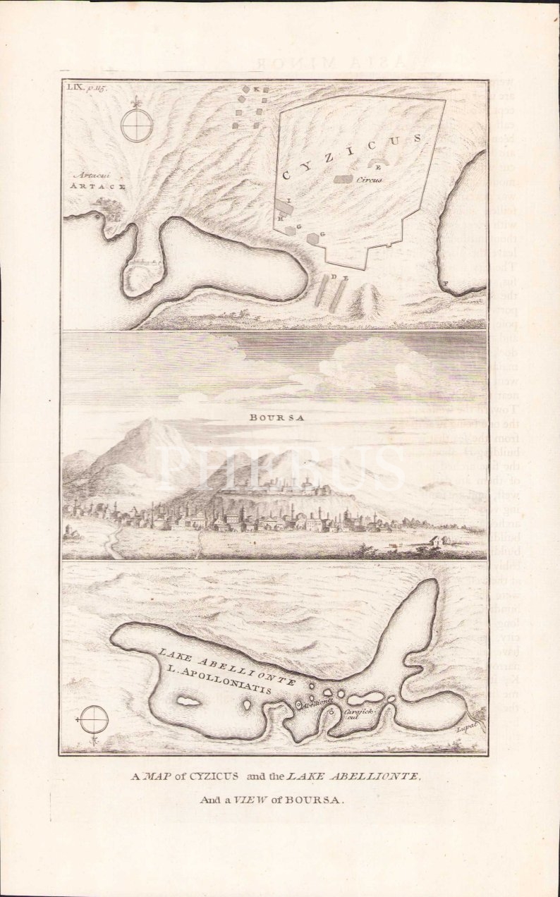1745 yılında Kizikos, Uluabat Gölü ve Bursa Haritası Gravürü, Richard Pockoke, 23x37 cm