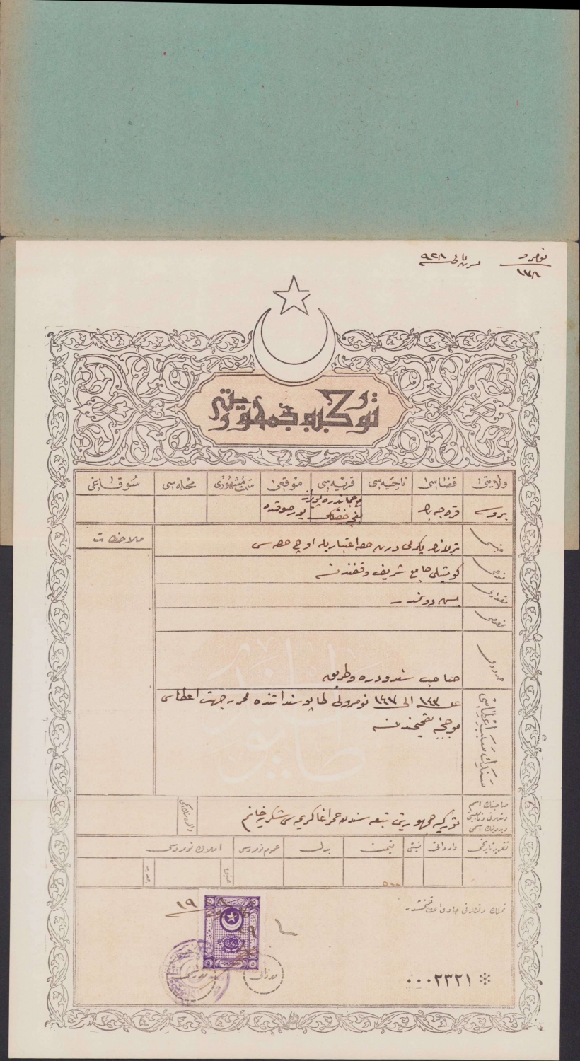Osmanlı tapu senedi, Bursa - Karacabey, 1928 tarihli, kendi kabında, pullu, damgalı, 22x32cm