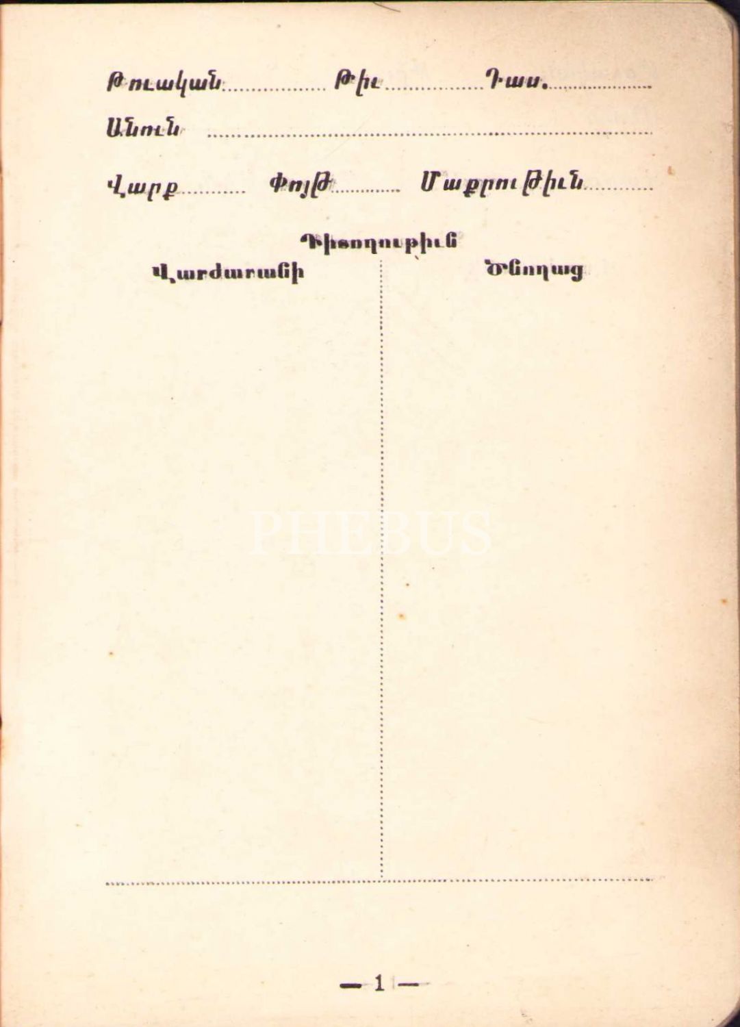 Ermenice Pangaltı Mıhitaryan Lisesi Haftalık Eğitim Defteri [Lise Pangalti, Dedr Şapatagan Tidoğutyun], 40 sayfa, 10x14 cm