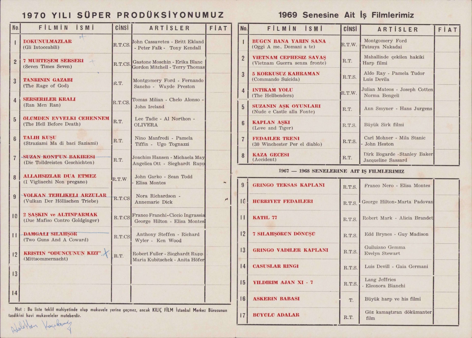Kılıç Film, Hüsnü Kılıç, 1970 yılı film kataloğu, 2 yaprak, 17x25cm