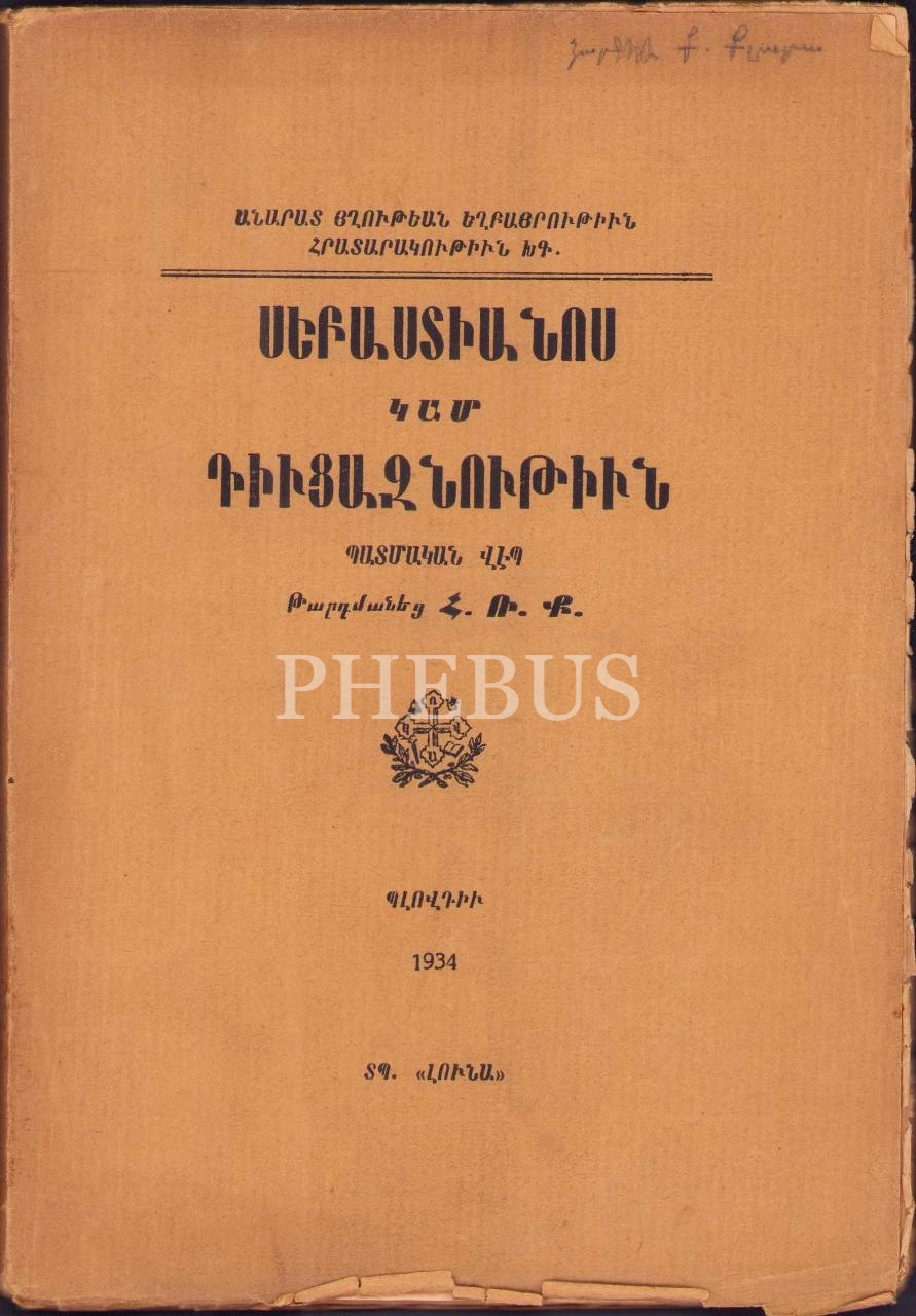 Ermenice Çeviri Roman: Sebastianos Veya Kahtamanlık [Sepasdianos Gam Tütsaznutyun], K., H. R., Luna Matbaası, 1934, 139 sayfa, 15x21 cm