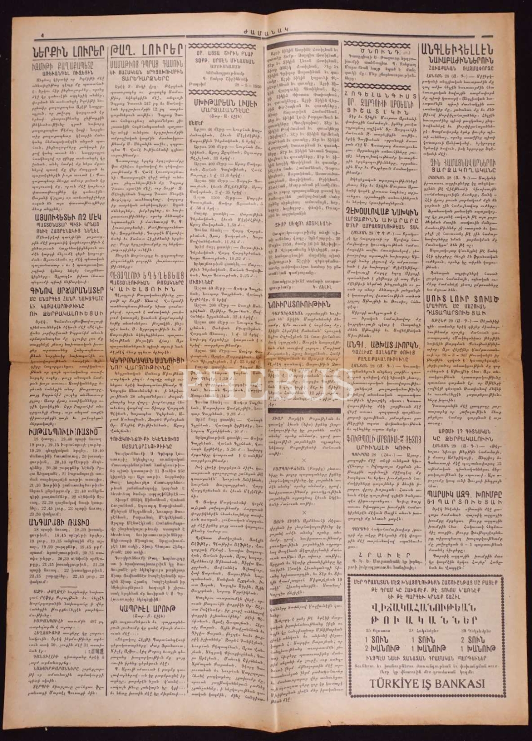 Ermenice Jamanak Gazetesi, Galata/İstanbul Baskı, 1950, 4 sayfa, 41x58 cm