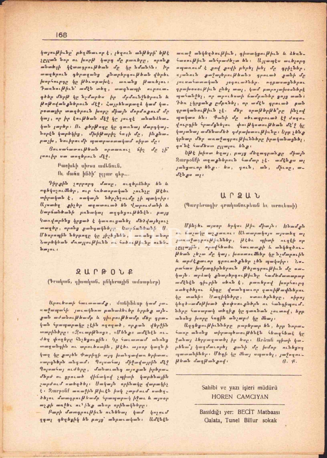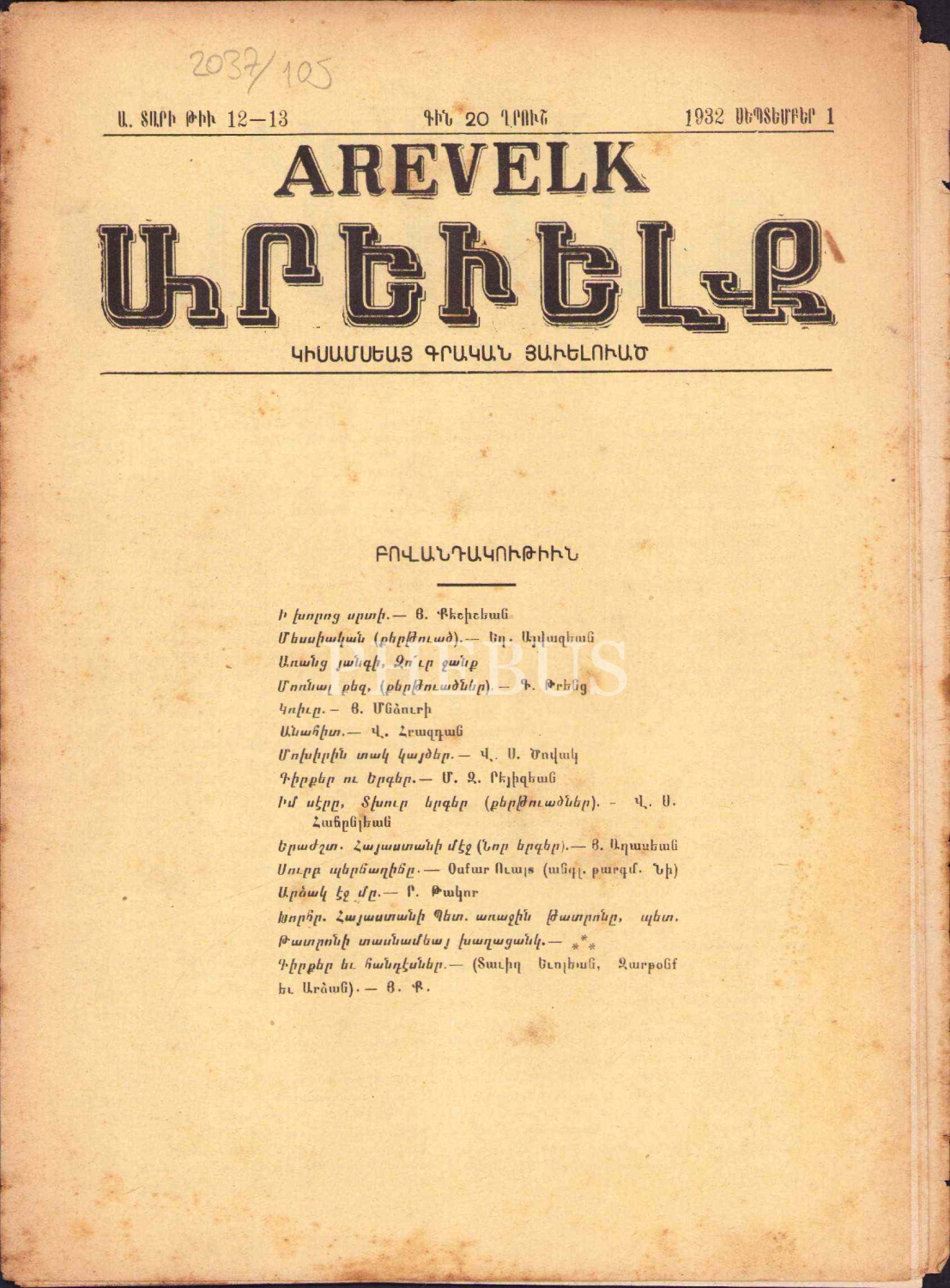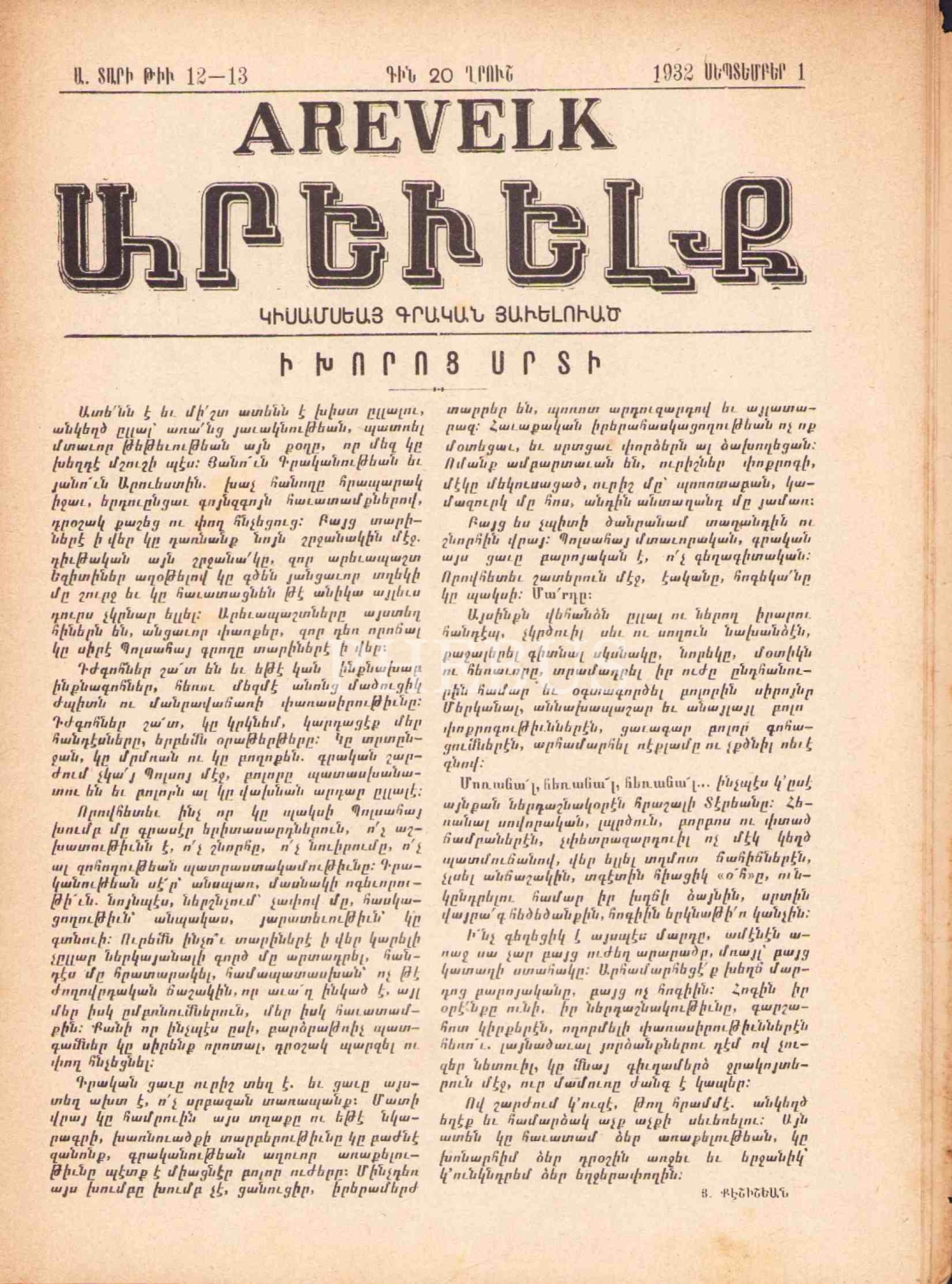Ermenice "Arevelk" Dergisi, 1932, 22 sayfa, 21x29 cm
