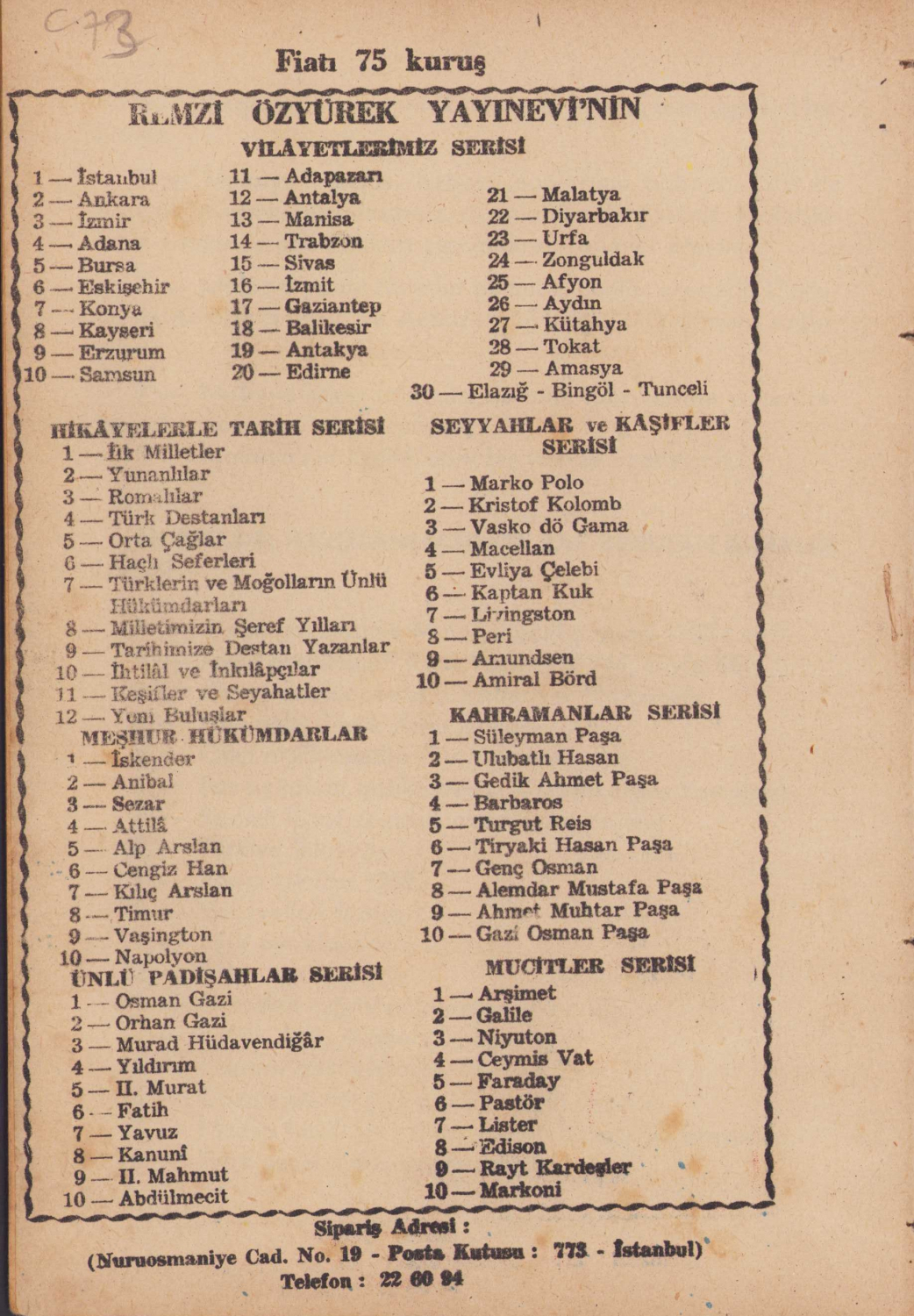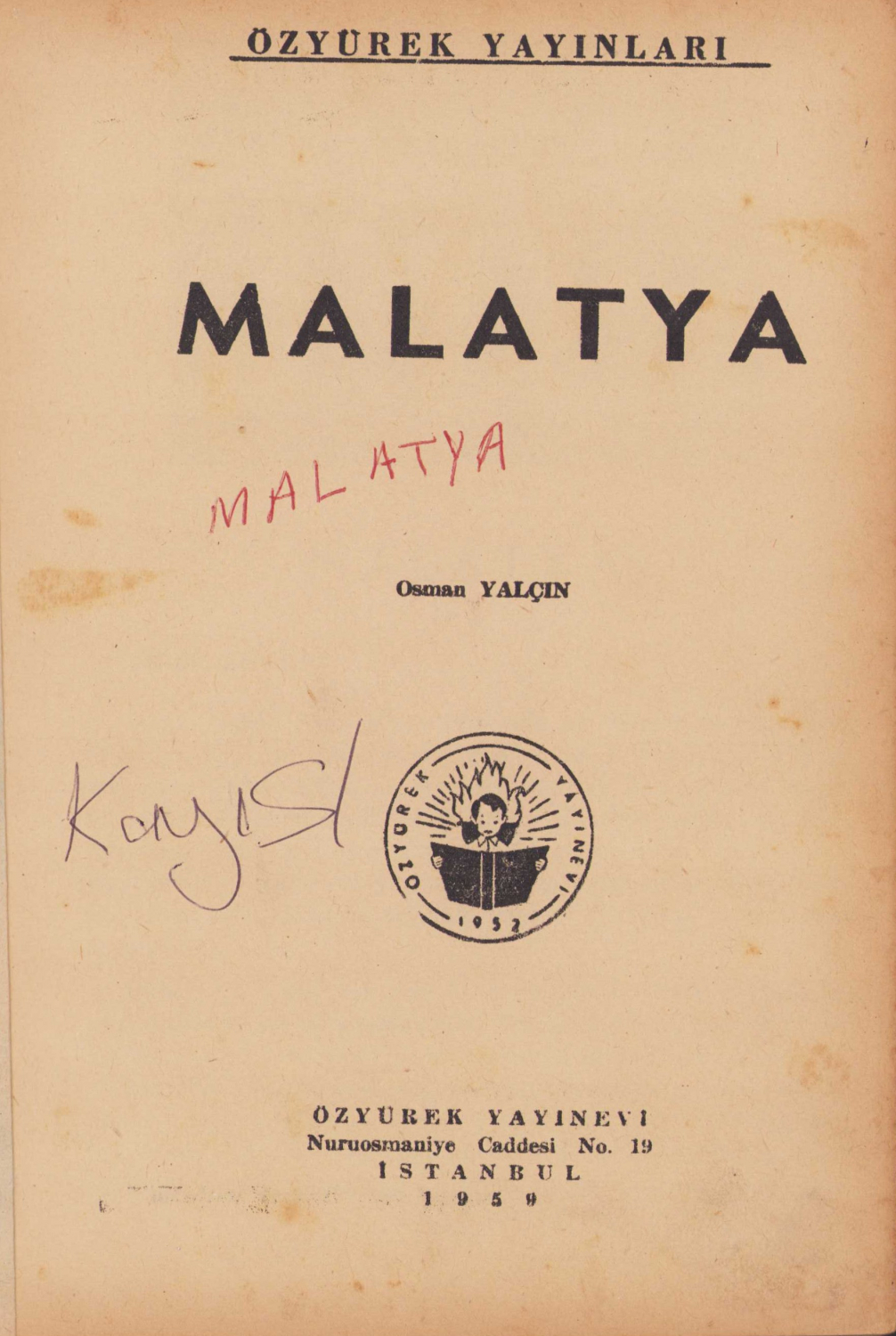 Kısa Tarih: Malatya, Yazan Osman Yalçın, Özyürek Yayınevi, İstanbul, 1959 baskısı, 32 sayfa, ederi 75 kuruş, 16,5x24 cm