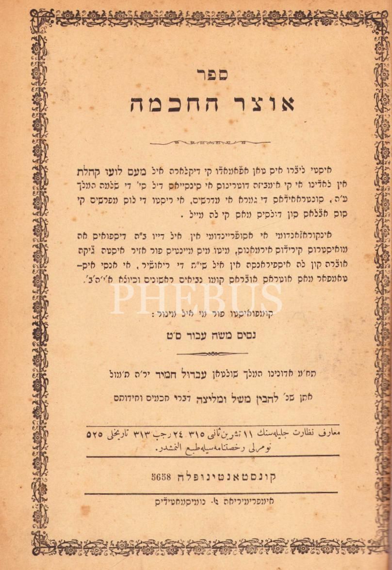 İbranice Kitap, Otzar HaHochma, Constantinople Baskı, 5658, 192 sayfa, Zihin Geliştirme Konulu, Cildi yıpranmış haliyle, 19x26 cm