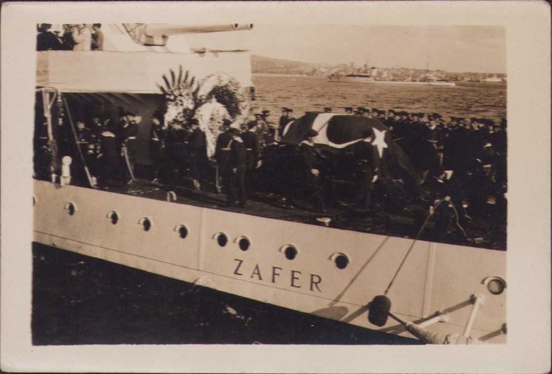 Atatürk'ün naaşı Zafer gemisinde taşınma anı, bahriyeli subaylar selam duruşunda, 9,5x6,5cm