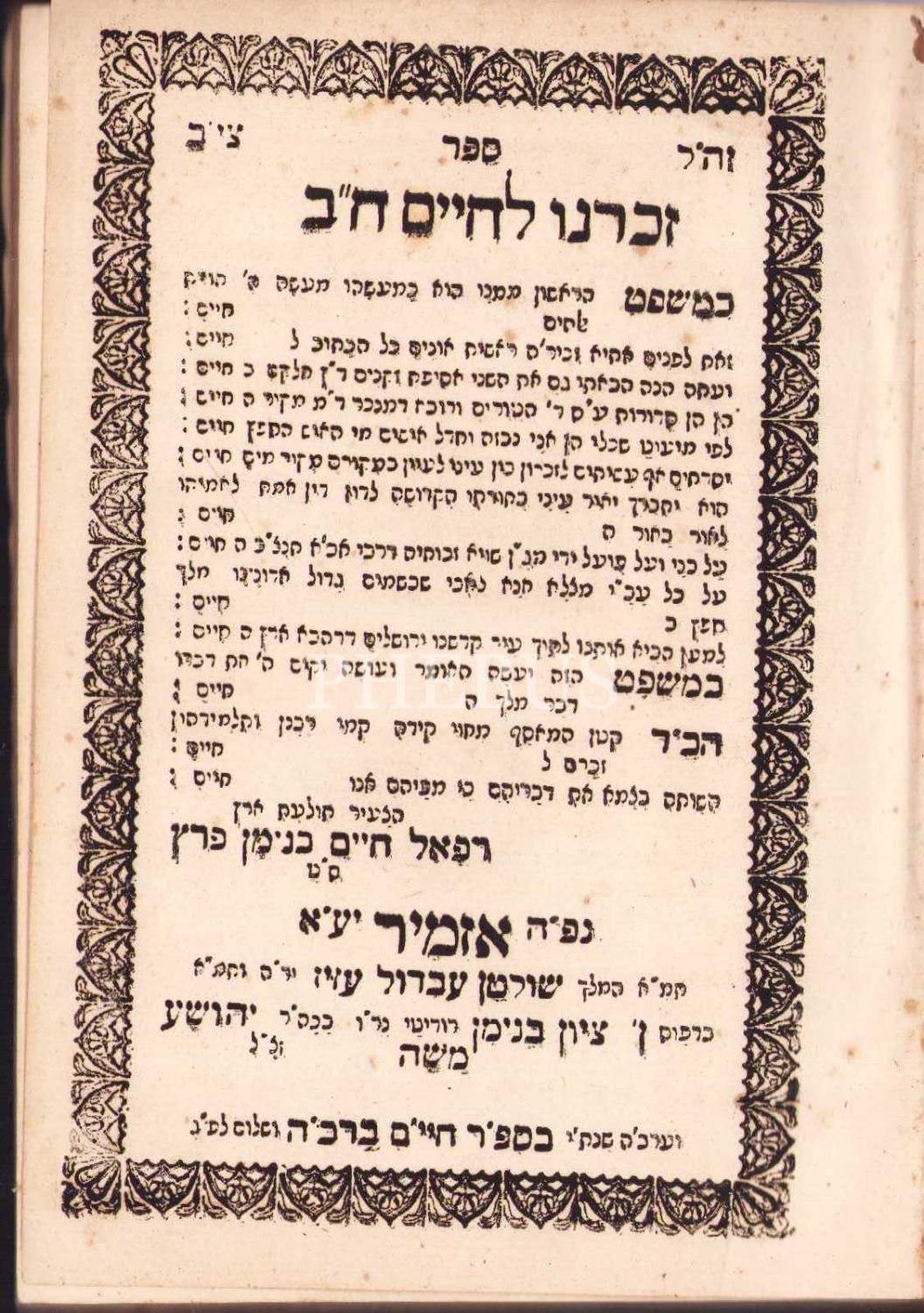 Hebrew book, Zochreinu l'Chaim, 5637 Izmir edition, the imprint page is