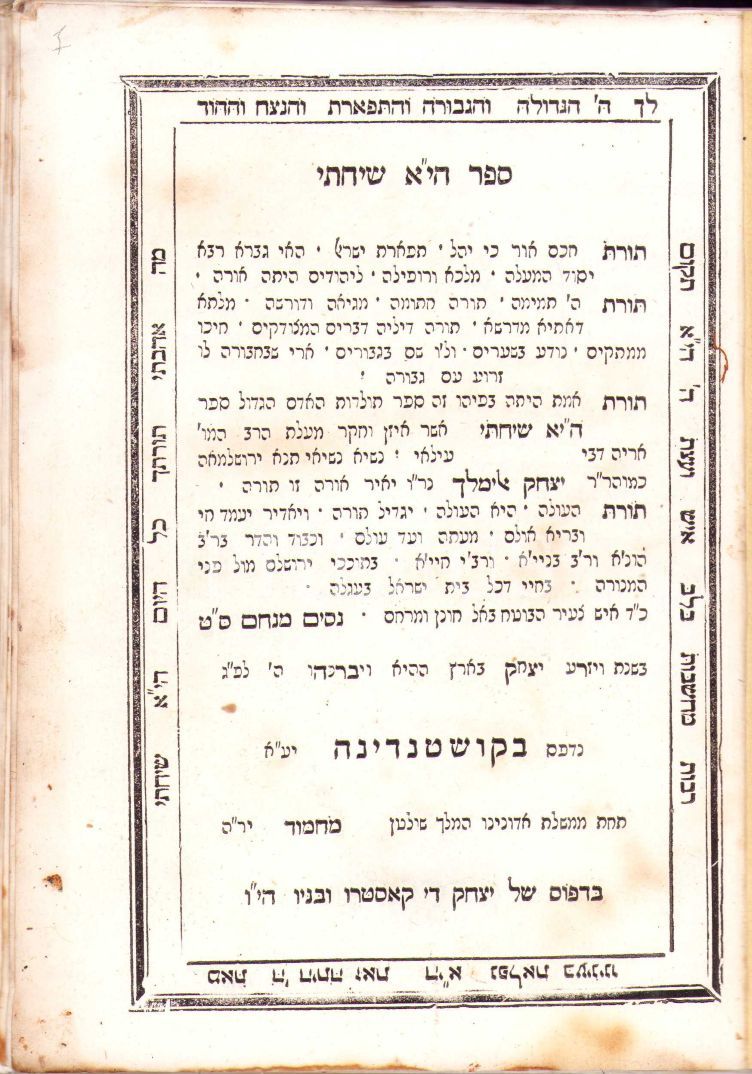Hebrew book, lithography, Constantinople the imprint page is dedicated to Sultan Mahmud. 176 pages, 16x22cm