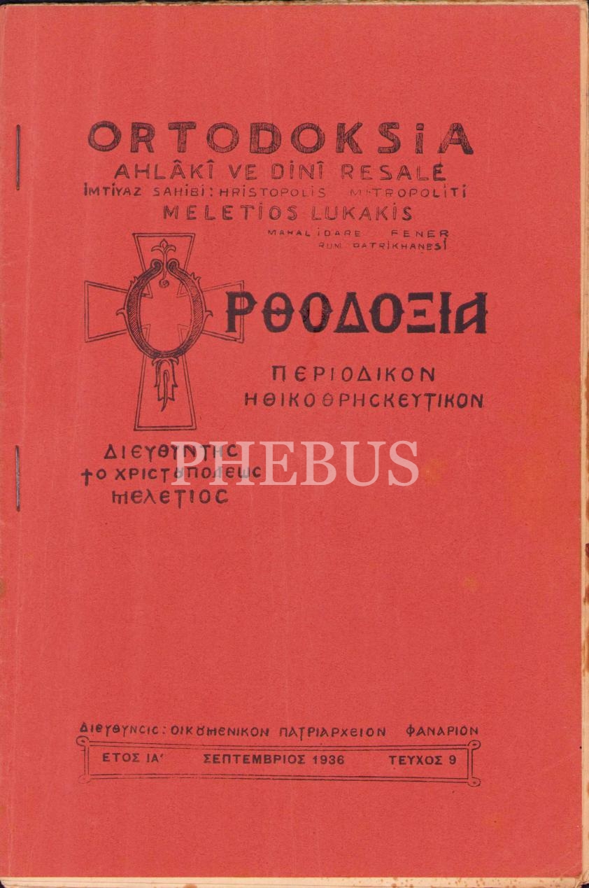 Ortodoksia Ahlâkî ve Dinî Risale (İmtiyaz sahibi Meletios Lukakis),Sene:XI Sayı:IX, Rum Patrikhanesi İstanbul, Eylül 1936, 28 sayfa, 16x24 cm