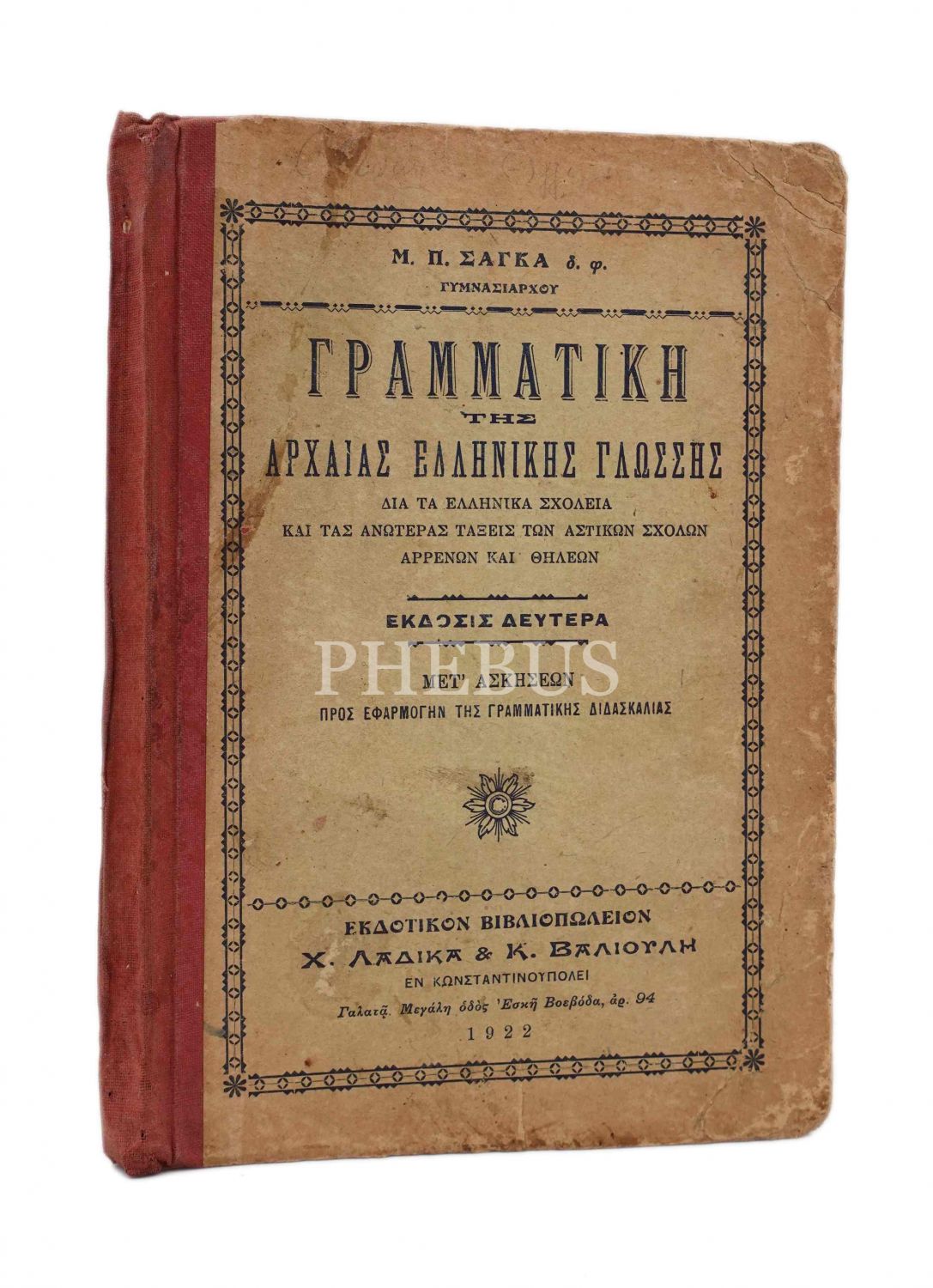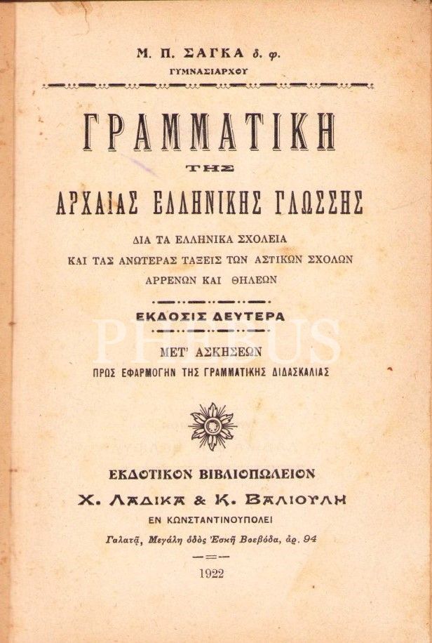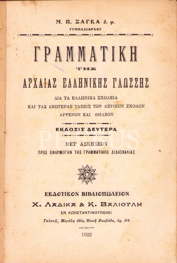 Γραμματικη της Αρχαιας Ελληνικης Γλωσσης(Antik Yunan Dili Dilbilgisi),M.P.Saga, Ladika-Valiuli Yayınevi, 2.baskı, İstanbul 1922, 271 sayfa, 14x20 cm