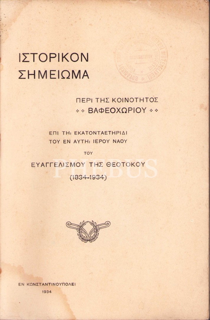 Ιστορικον Σημειωμα Περι της Κοινοτητος Βαφεοχωριου(Balıklı Cemaatine İlişkin Tarihi Notlar),İstanbul 1934, 90 sayfa, kapağı oldukça yorgun haliyle, 15x23 cm