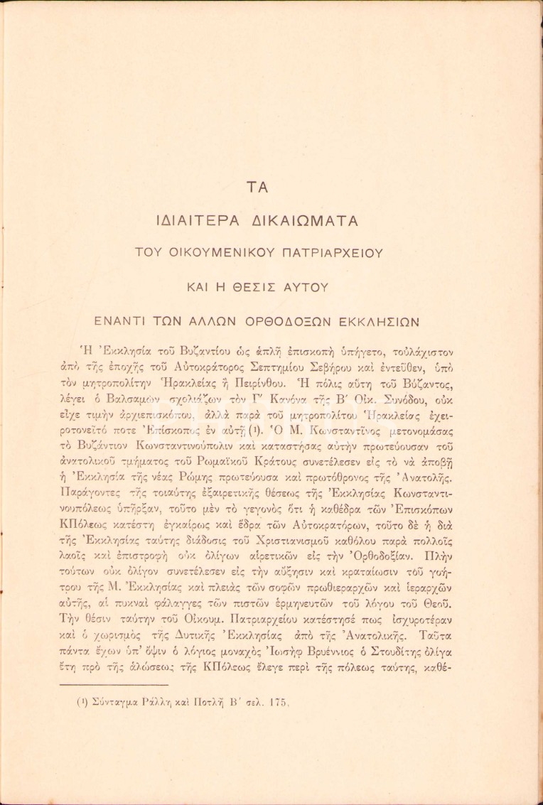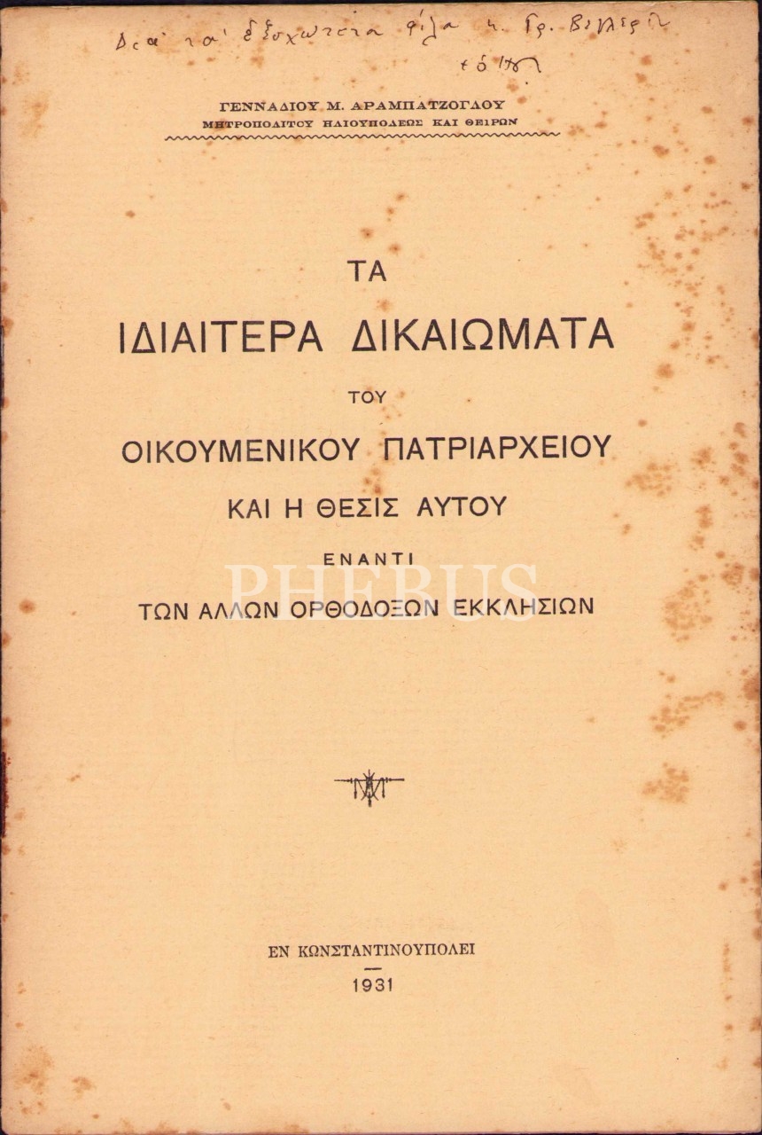 Τα Ιδιαιτερα Δικαιωματα του Οικουμενικου Πατριαρχειου και η Θεσις Αυτου Εναντι των Αλλων Ορθοδοξων Εκκλησιων(Ekümenik Patrikhanenin Özel Hakları ve Diğer Kiliseler Arasındaki Yeri), Gennadios Arabacıoğlu, İstanbul 1931, 20 sayfa, 16x23 cm