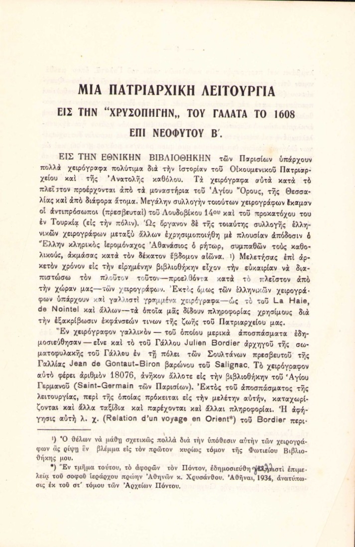 Μια Πατριαρχικη Λειτουργια εις την `Χρυσοπηγην` του Γαλατα το 1608 επι Νεοφυτου Β` (Patrik Neofitos II. döneminde 1608 yılında Galata'da bir Patrikhane Ayini), Αydın ve Tire Metropoliti Gennadios, İstanbul 1948, 14 sayfa, 15x23 cm