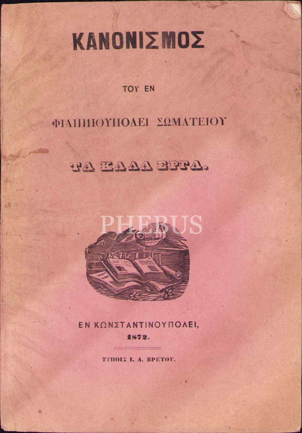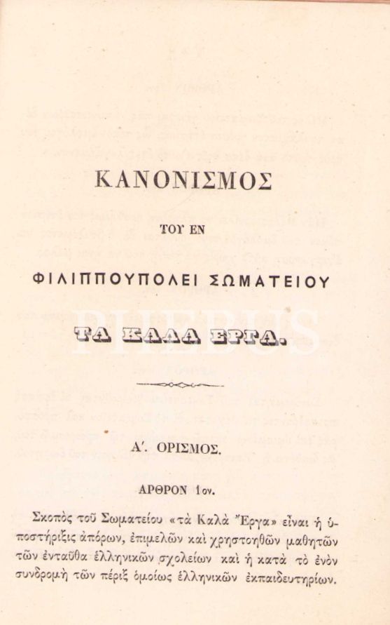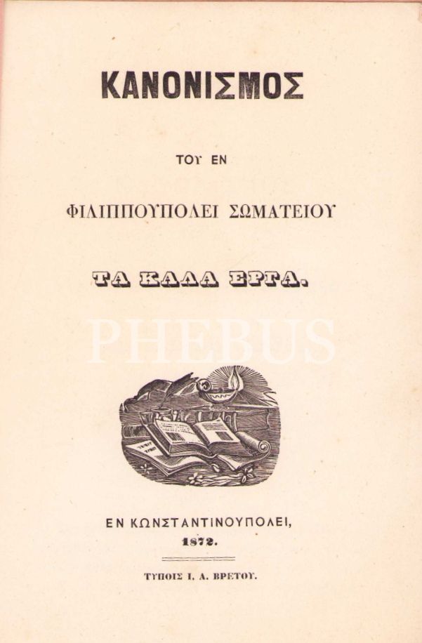 Κανονισμος του εν Φιλιππουπολει Σωματειου "Τα Καλα Εργα"(Filibeli "Ta kala Erga" Birliği Nizamnamesi),I.A. Vretu Matbaası, İstanbul 1872, 8 sayfa, 13x18 cm