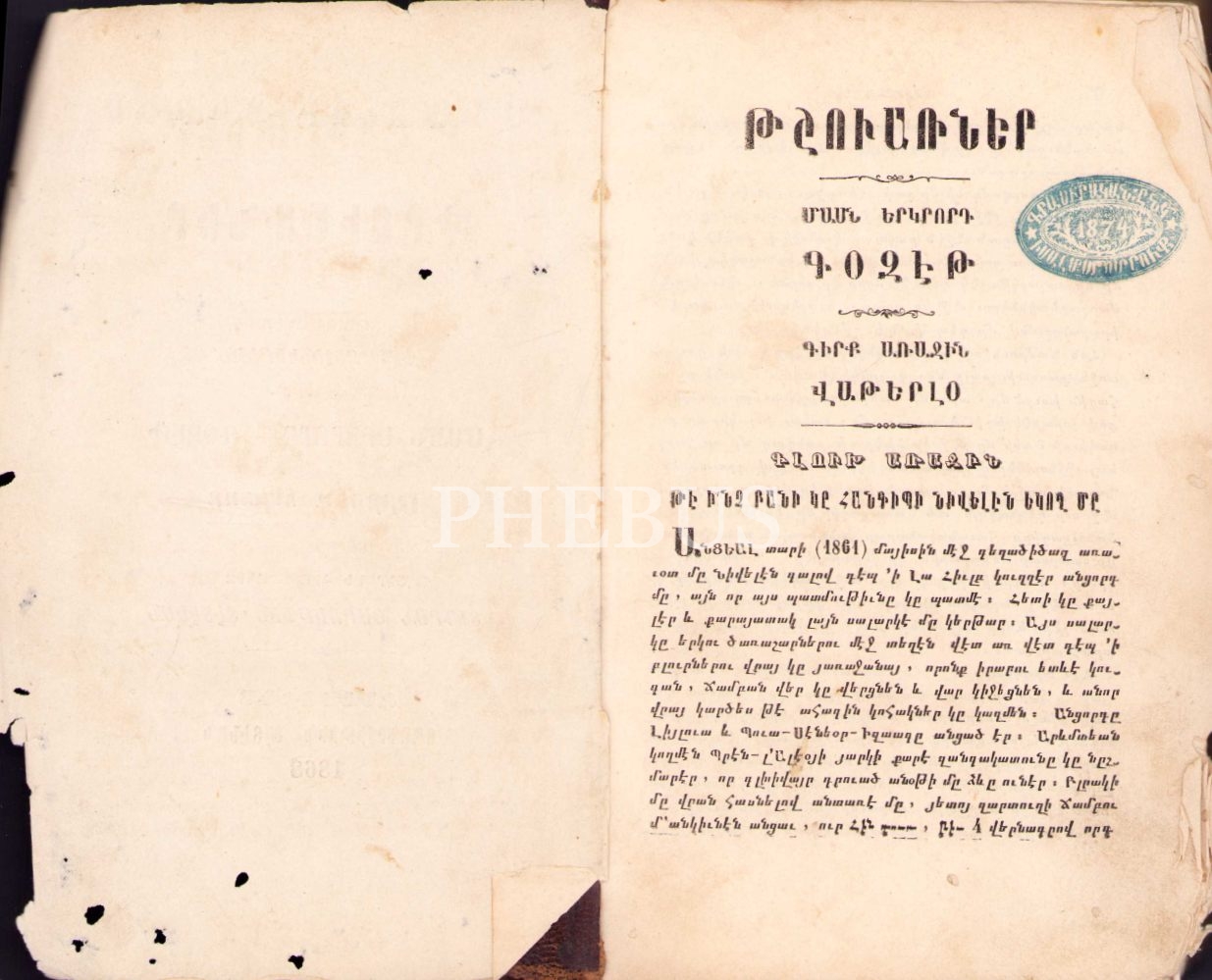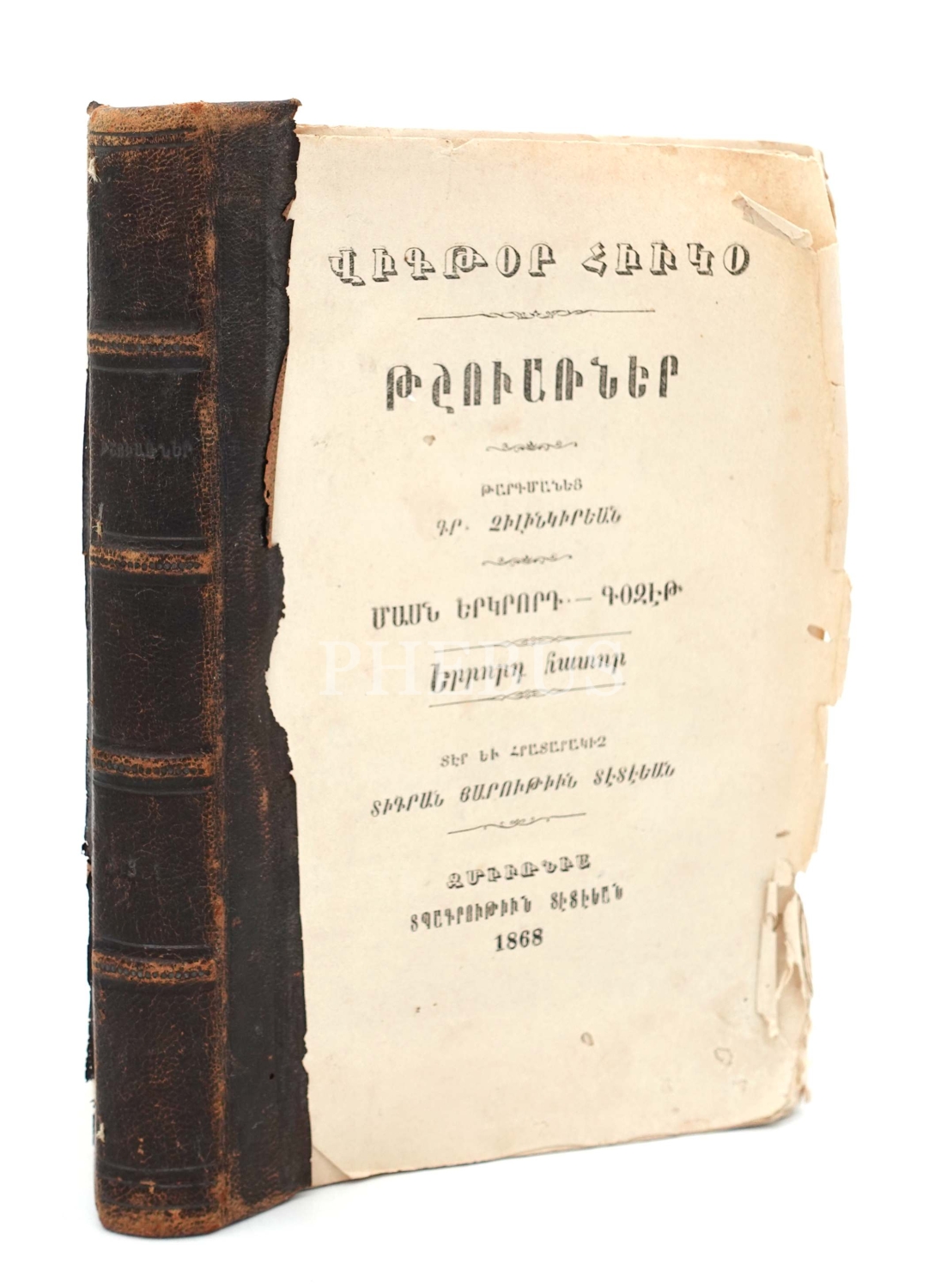 Ermenice Sefiller, 2. Bölüm, 3. Cilt [Tşuarner, Masın 2., 3. Hador], Victor Hugo, Çeviri: Krikor Çilingiryan, Dedeyan Matbaası, İzmir - 1868, 194 sayfa, ön kapağı yırtılmış haliyle, 14x21 cm