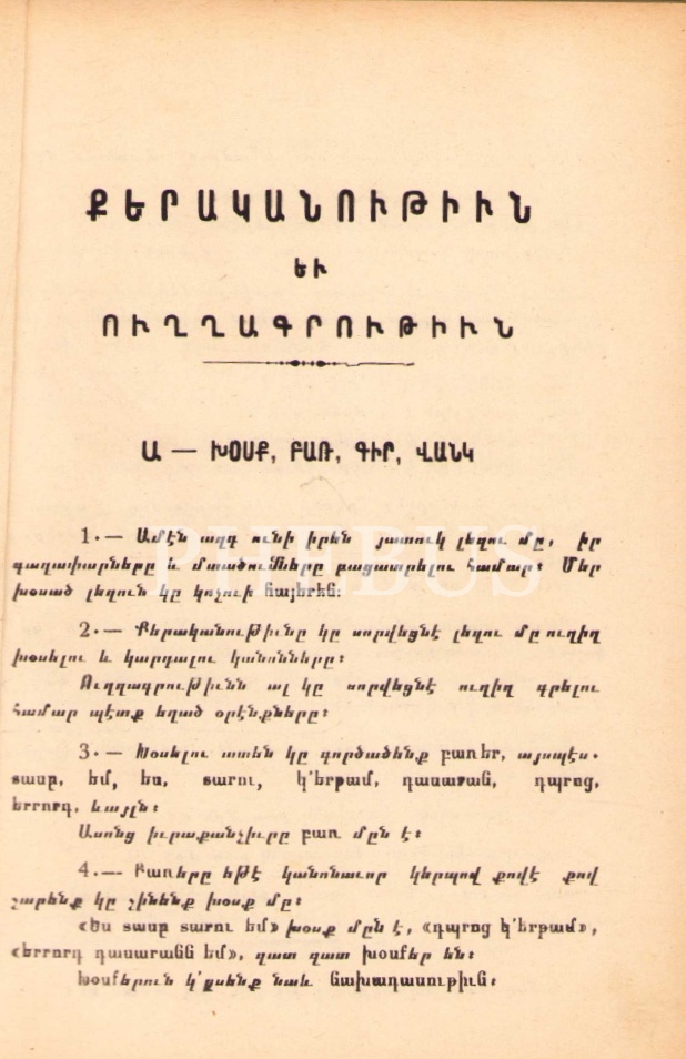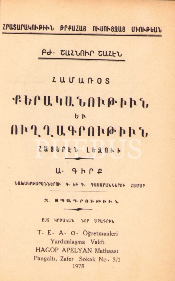 Ermenice Kitap: Ermeni Lisanının Kısa Grameri Ve İmlası [Hamarod Keraganutyun Yev Uğğakrutyun Hyeren Lezui], Şahnur Şahen, Hagop Apelyan Matbaası, İstanbul - 1978 Baskı, 80 sayfa, kapak kenarları yıpranmış haliyle, 14x18 cm