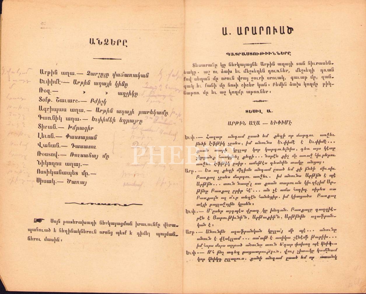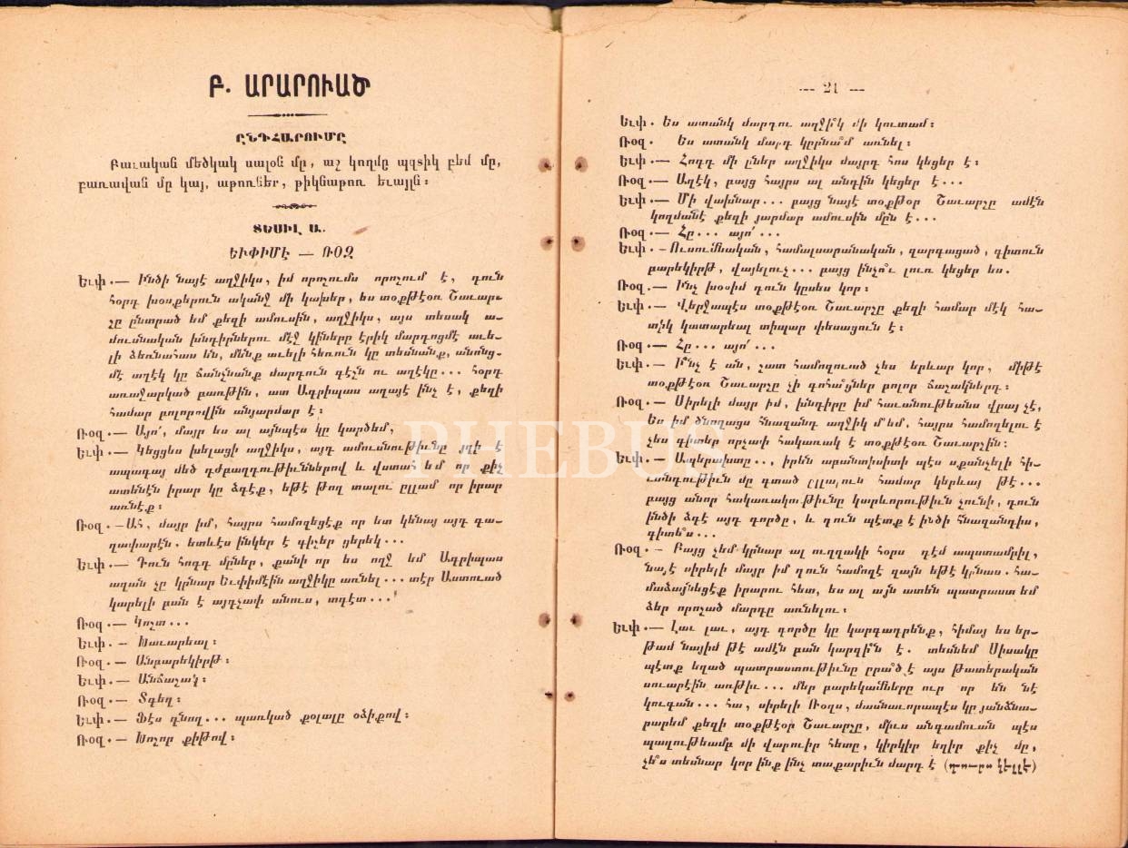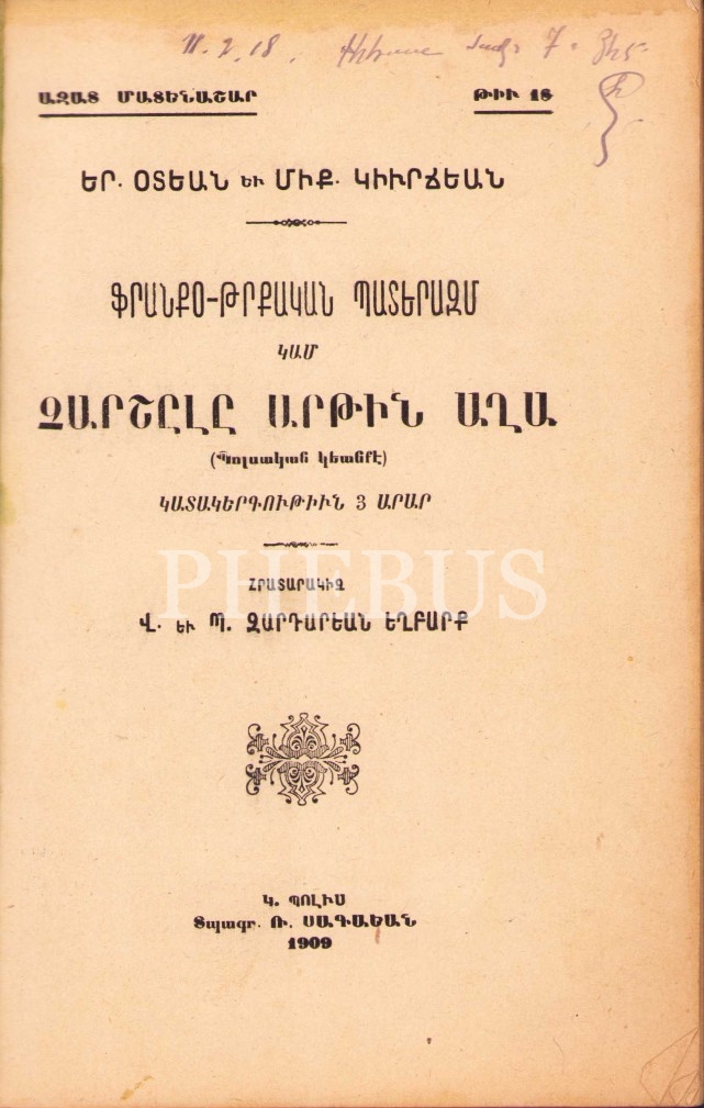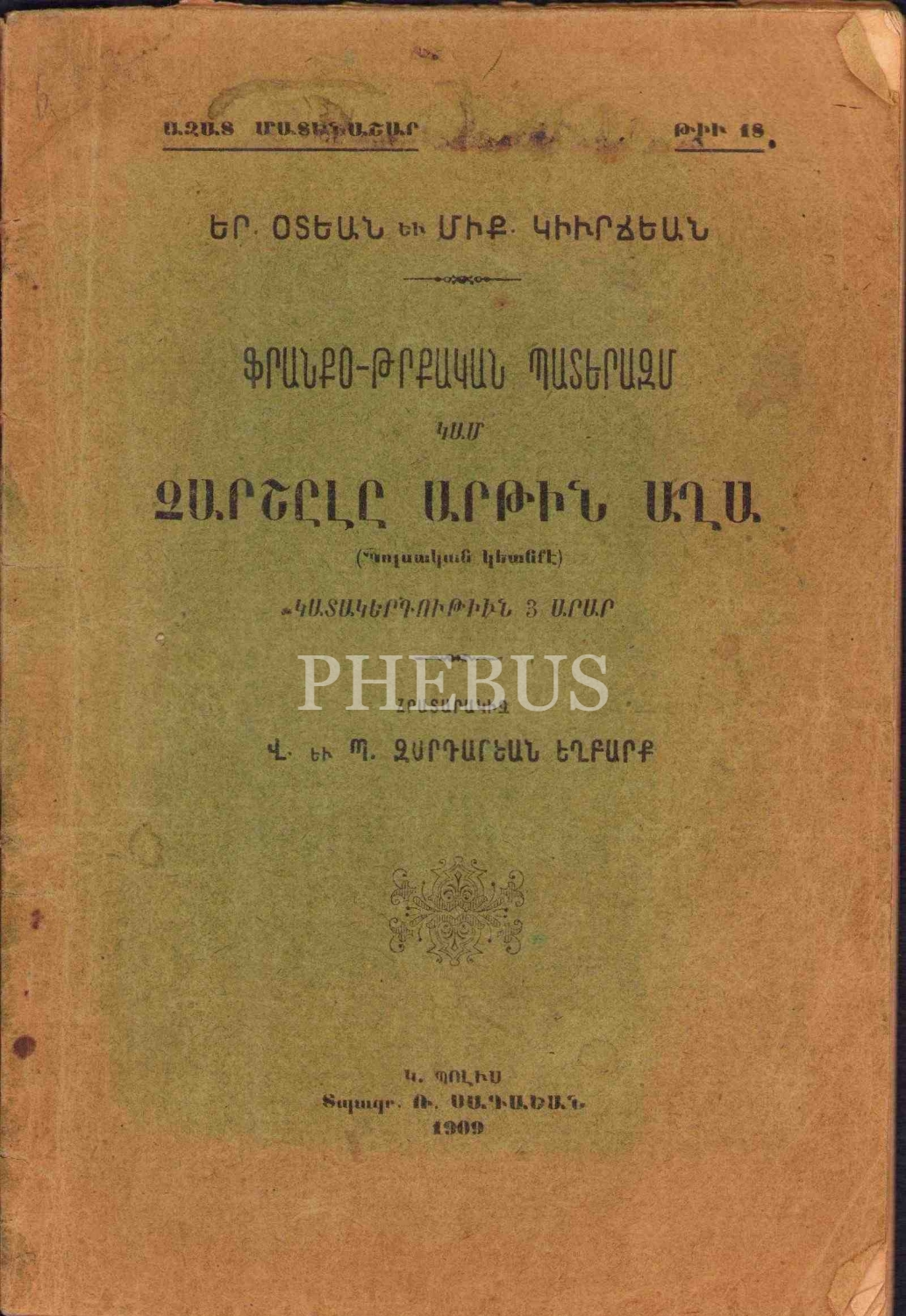 Ermenice Kitap: Fransız Türk Savaşı Veya Çarşılı Artin Ağa [Franko-Trkagan Baderazm Gam Çarşılı Aritn Ağa], Odyan, Yervant/Gürcüyan, Mikayel, R. Sakayan Matbaası, İstanbul - 1909, 48 sayfa, 13x20 cm