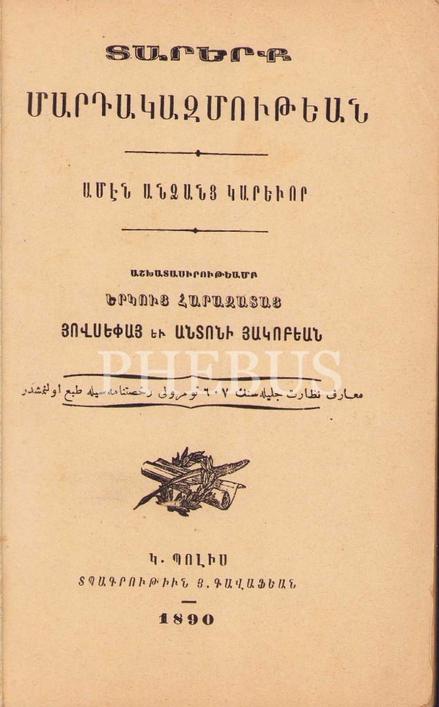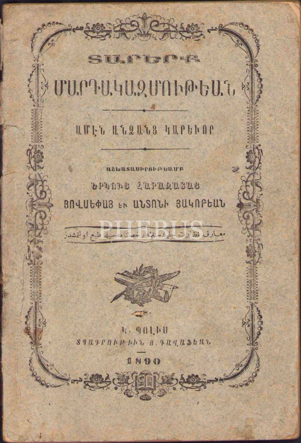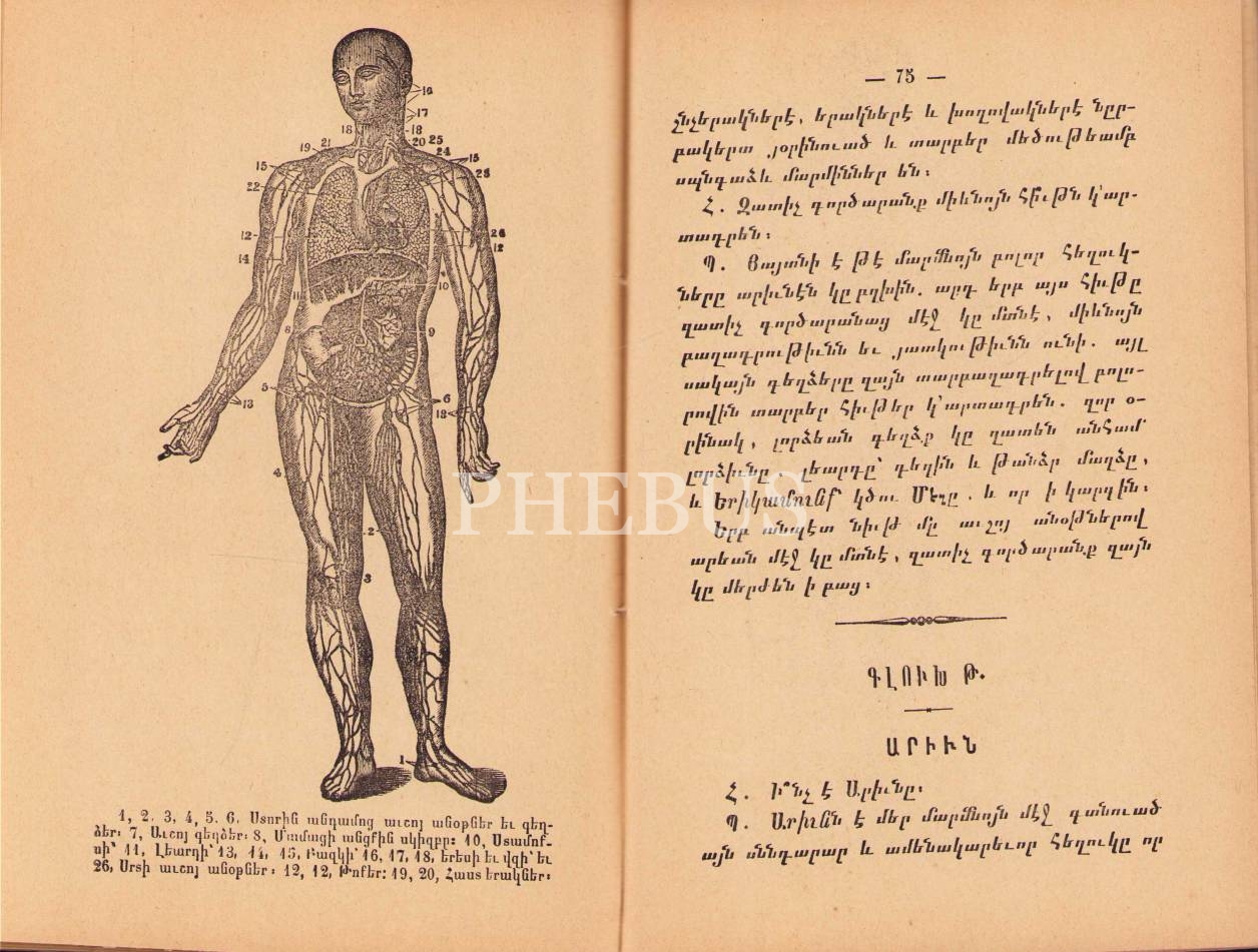 Ermenice Anatomi Kitabı: Anatominin Başlangıcı [Darerk Martagazmutyan], Hovsep ve Andon Hagopyan, Kavafyan Matbaası, İstanbul - 1890, 102 sayfa, 12x17 cm