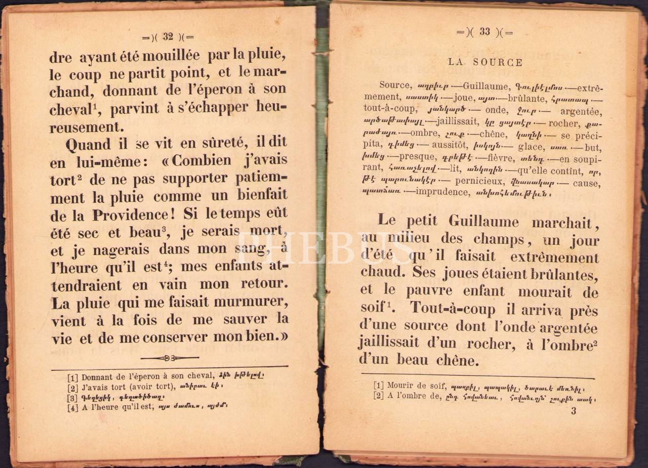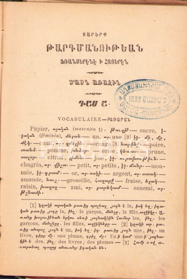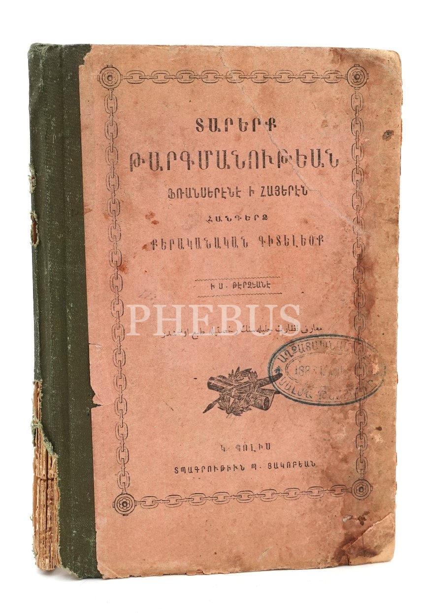 Ermenice-Fransızca Kitap: Fransızcadan Ermeniceye Tercümeye Başlangıç [Franserene Hayeren Darerk Tarkmanutyan], S. Terziyan, Hagopyan Matbaası, İstanbul, 112 sayfa, cilt kenarı ve sırtı yıpranmış haliyle, 12x18 cm