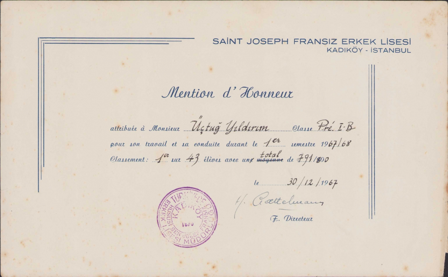 Sain Joseph Fransız Erkek Lisesi tarafından verilmiş Şeref Ödülü, 1967 tarihli, Kadıköy adresli, 26x16cm