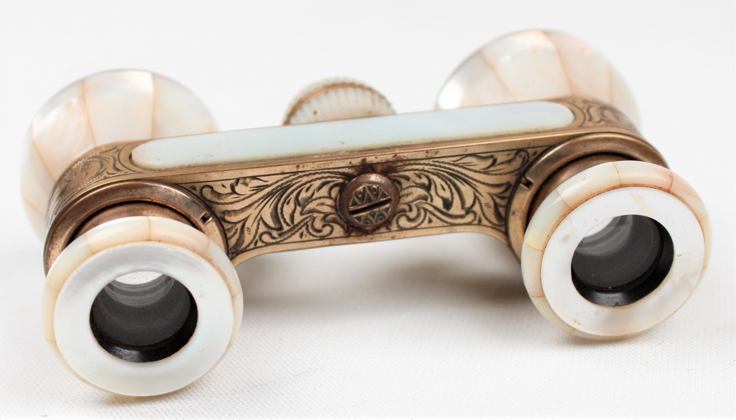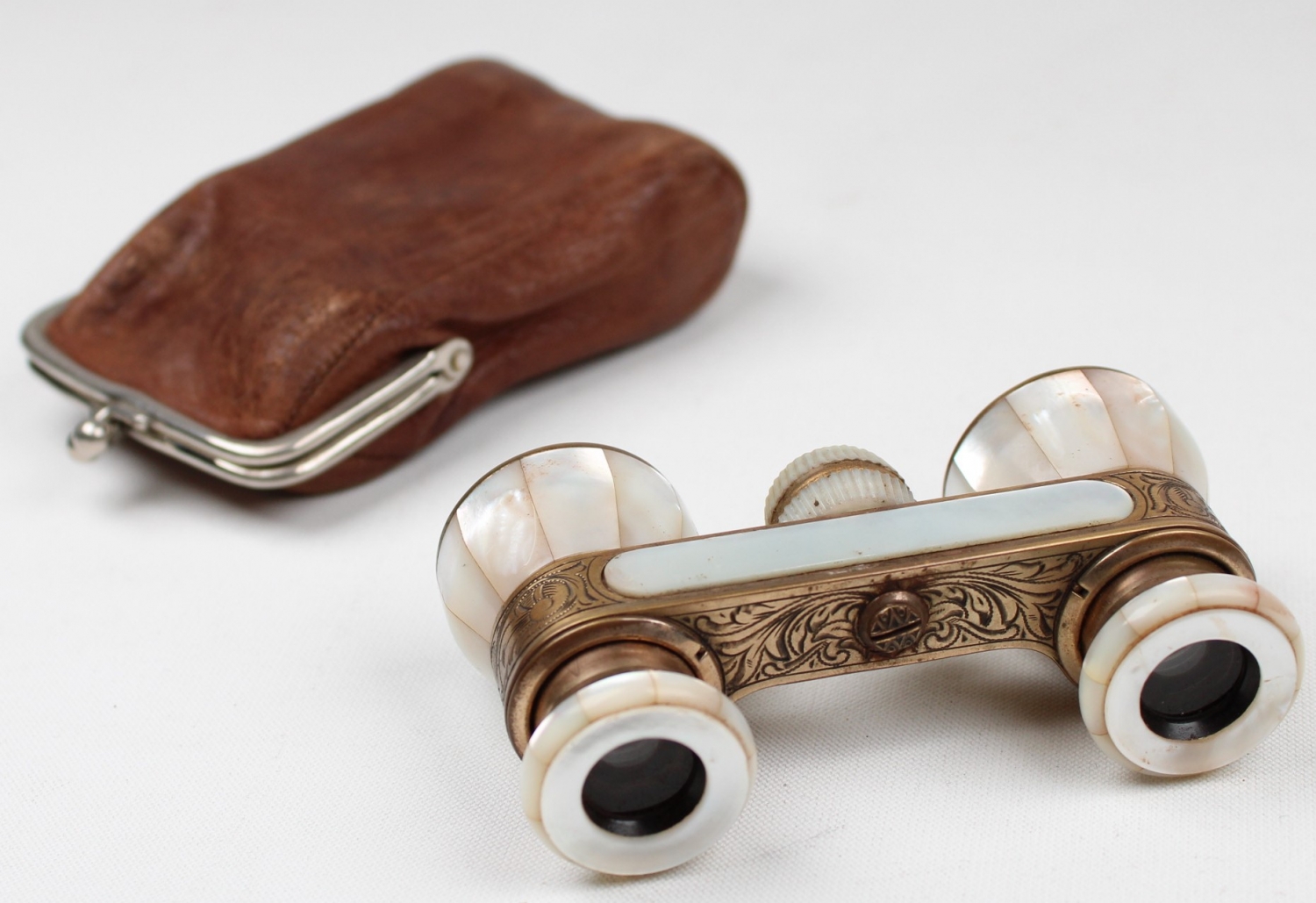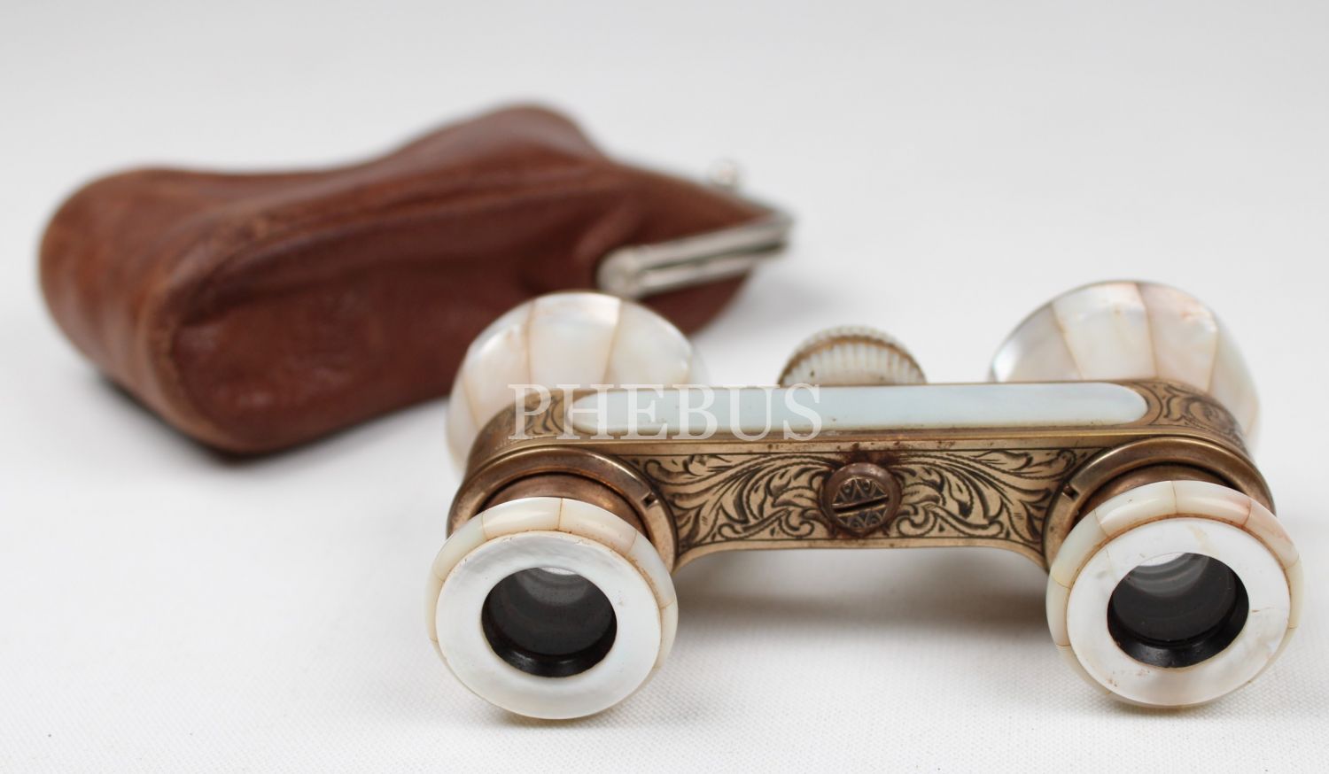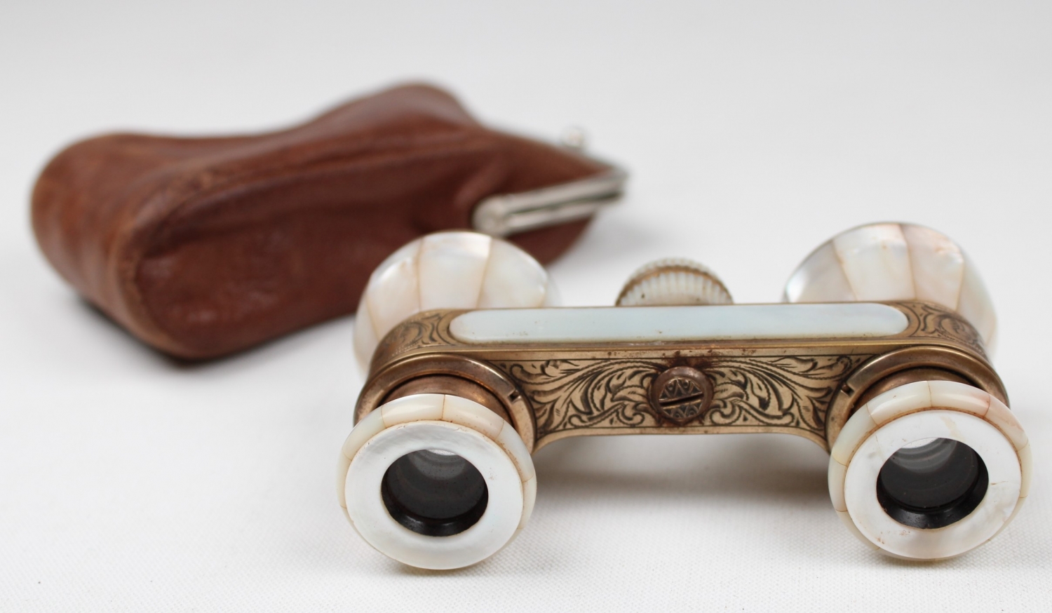 Fransız sedef dürbün, deri kabında, pirinç üzeri kalem işçilikli 5x10 cm