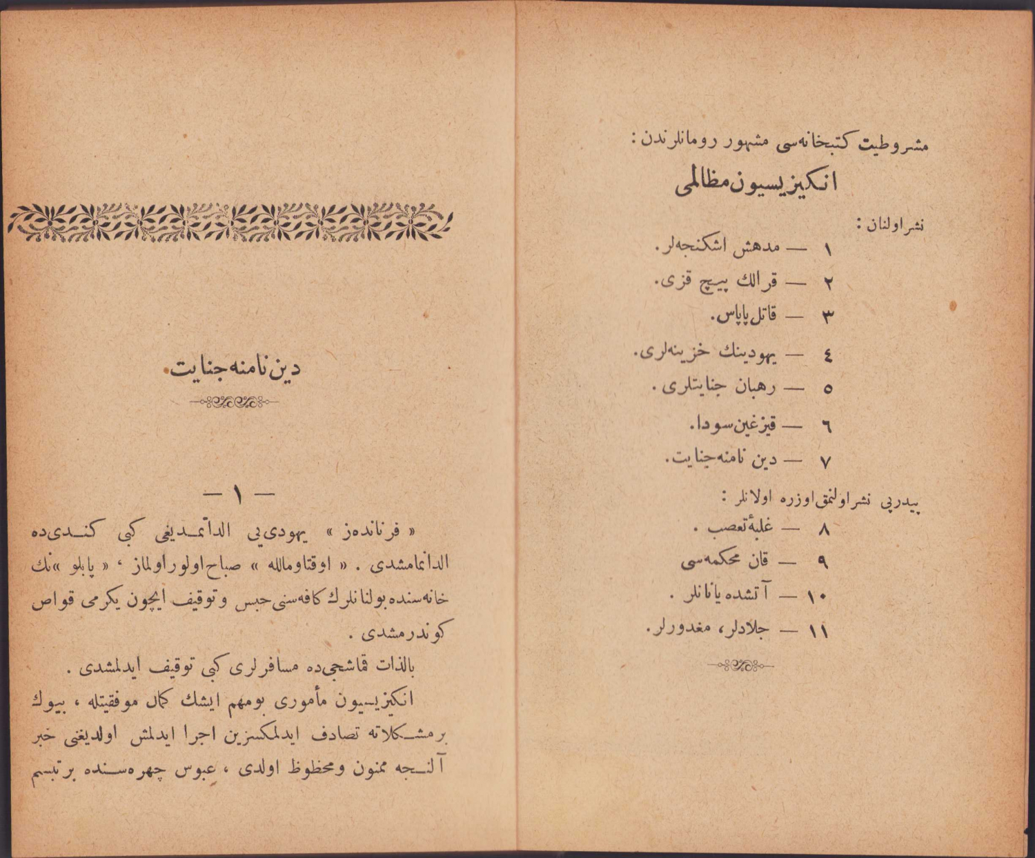 Engizisyon Mezalimi Din Namına Cinayet, Çeviren Süleyman Tevfik, Meşrutiyet Matbaası, Dersaadet, Osmanlıca, 118 sayfa, 12x18 cm, 7. Seri, ciltten çıkmış
