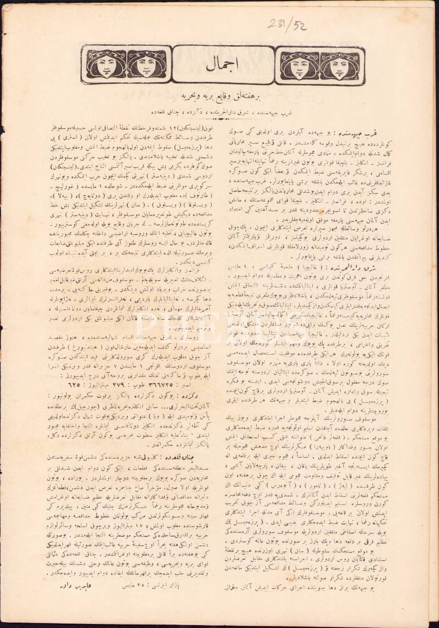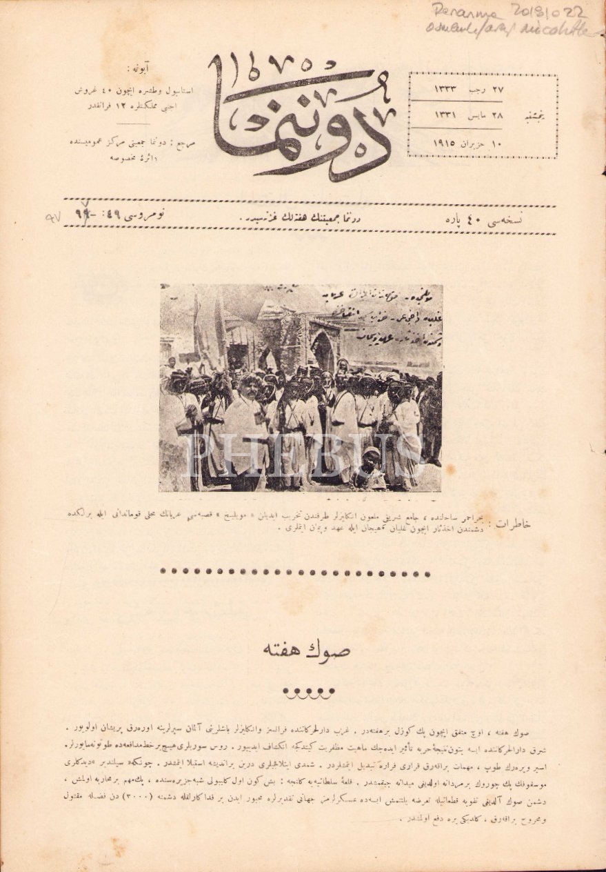 Osmanlıca Donanma dergisi, sayı: 99-49, 10 Haziran 1915, Kızıldeniz sahilinde bir caminin İngilizler tarafından tahrip edilmesi üzerine intikam için toplanan halka ait ön kapak görseliyle, 24x34 cm, kapağı hafif yıpranmış haliyle