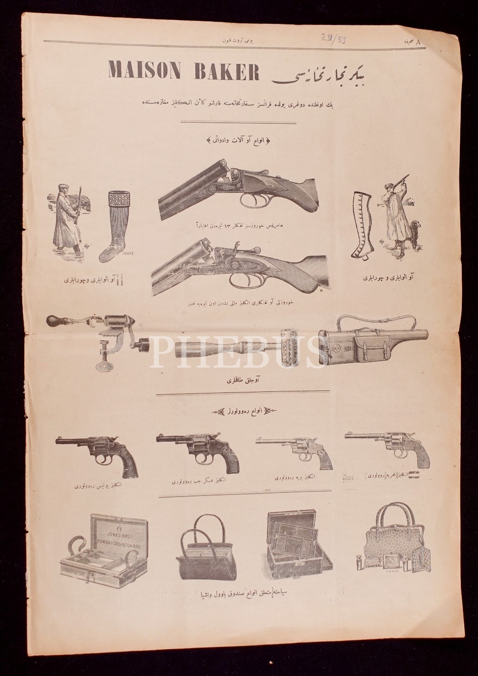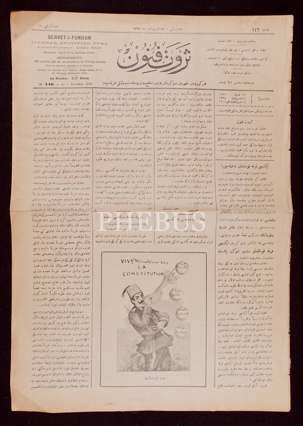 Osmanlıca Servet-i Fünun gazetesi 146. sayı, 25 Teşrinievvel 1324, 1908 Meşrutiyet Vive la Constitution [Yaşasın Anayasa] ön kapak ve Maison Baker reklamına ait arka kapak görseliyle, 8 sayfa, 34x48 cm, bir kenarı yıpranmış haliyle