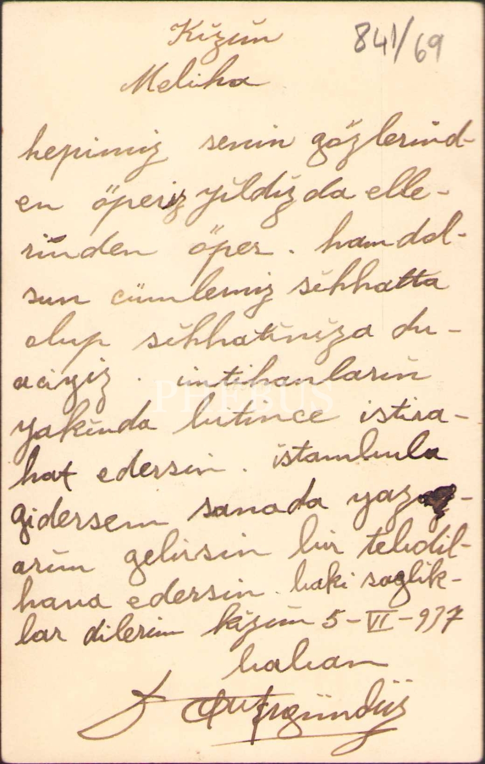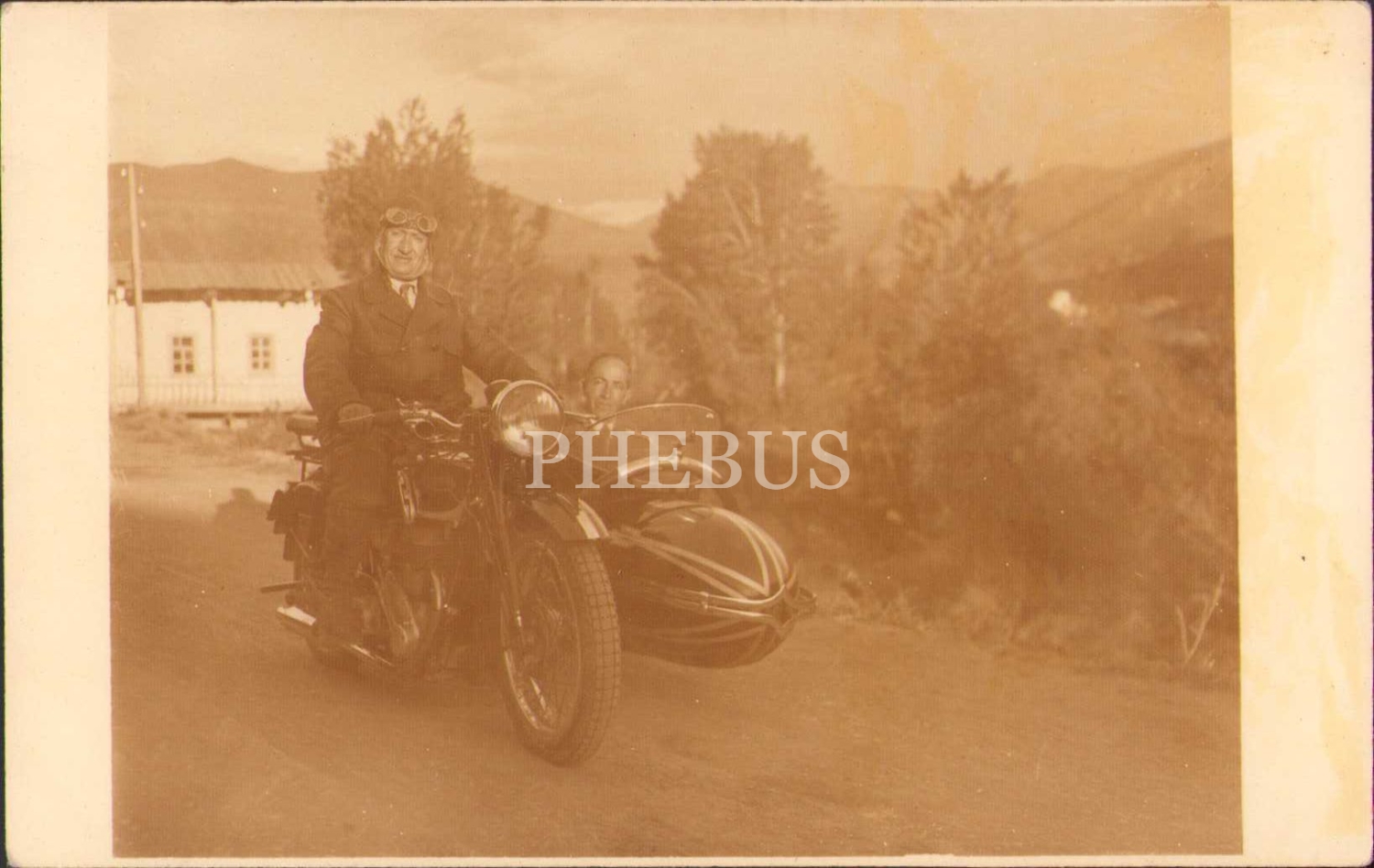 İki şahsın motosiklet sürüşü esnasındaki hatıra pozu, arkasında 1937 tarihli mektup mevcut, köşeleri hafif soyulmuş haliyle