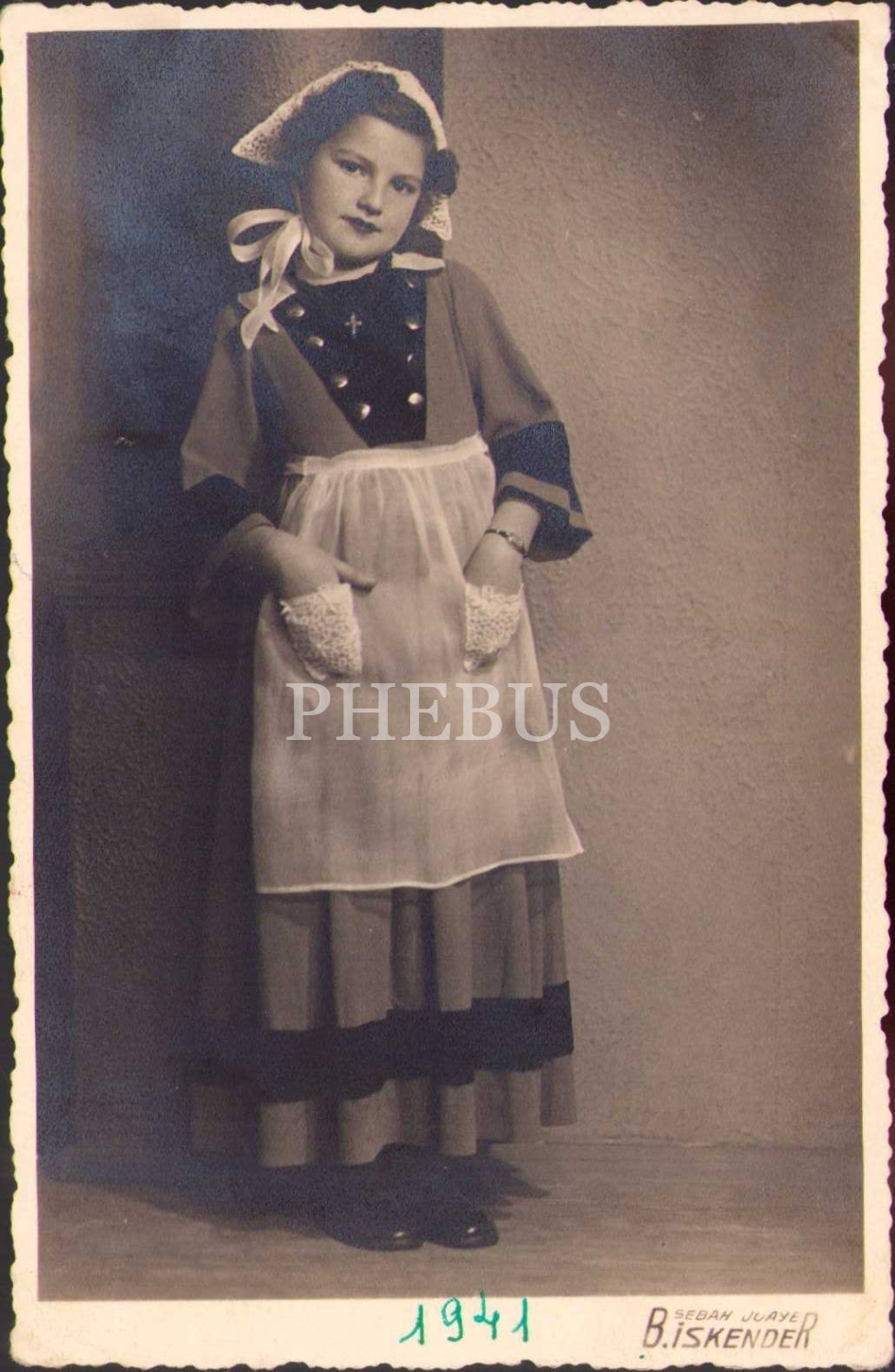 Haç kolyeli genç kız fotoğrafı, Sebah Juaye B. İskender Fotoğrafhanesi, arkası Fransızca yazılı ve 1941 tarihli, köşeleri hafif soyulmuş haliyle