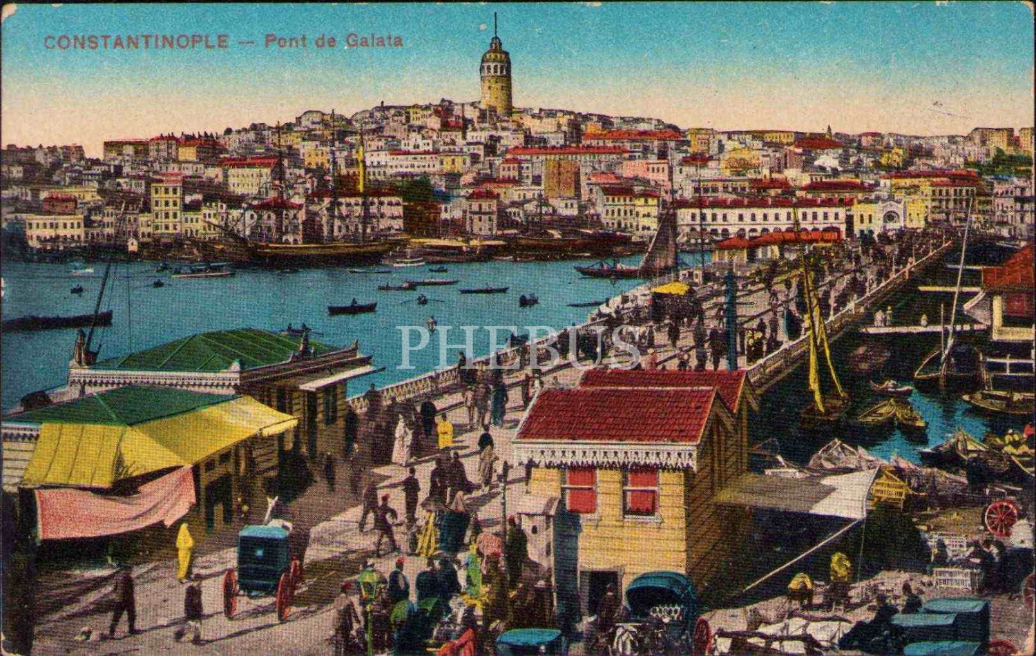 Galata Köprüsü ve Galata Köprüsü, Constantinople, İtalya baskı, köşeleri hafif soyulmuş haliyle