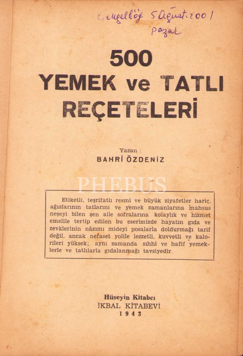 500 Yemek ve Tatlı Reçeteleri, Bahri Özdeniz, İkbal Kitabevi, İstanbul 1943, 352 s., 14x20 cm, cildi yıpranmış haliyle