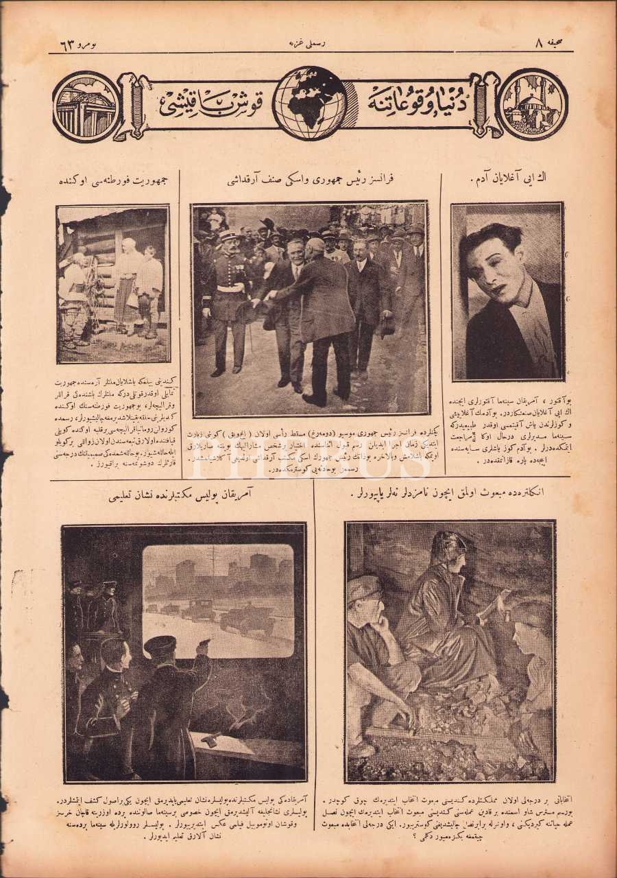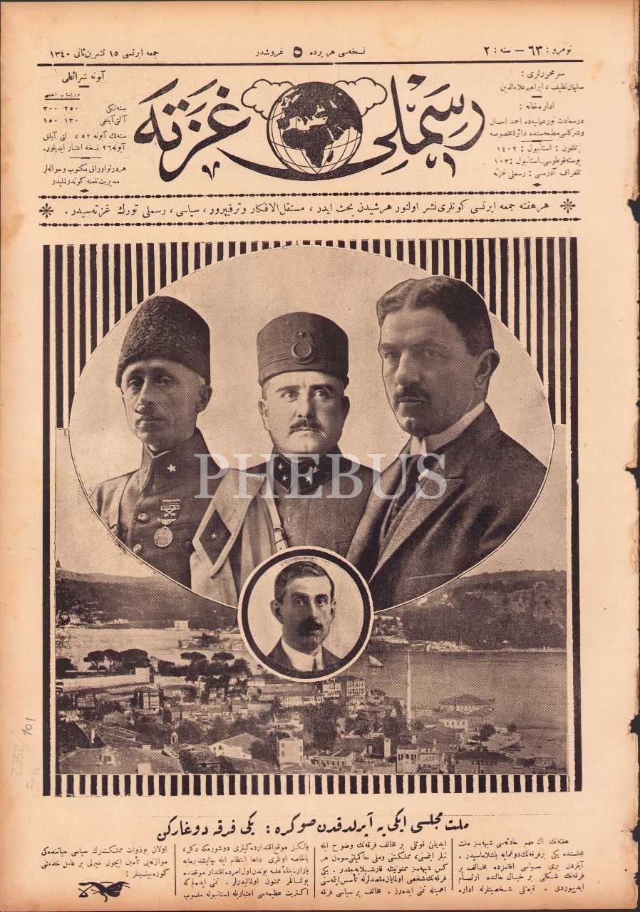 Osmanlıca Resimli Gazete 63. sayı, 15 Teşrinisani 1340, Rauf Orbay, Kâzım Karabekir vd.'ne ait ön kapak görseliyle, 27x39 cm, sırtı yıpranmış haliyle