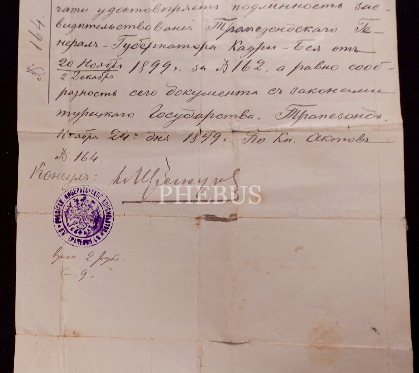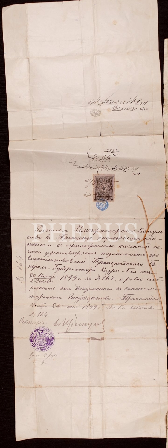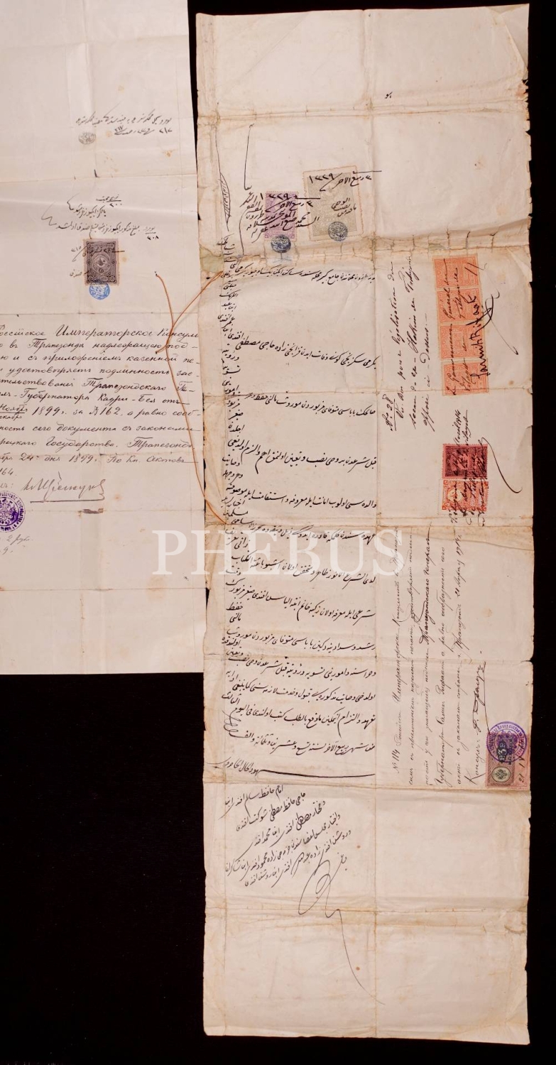 İki adet Osmanlıca hüccet: 1319 tarihli veraset belgesi ve 1329 tarihli vesayet belgesi, Trabzon/Batum, arkası ve kenarında Gürcüce(?) yazı mevcut, 20x57 cm ve 26x81 cm, yıpranmış haliyle